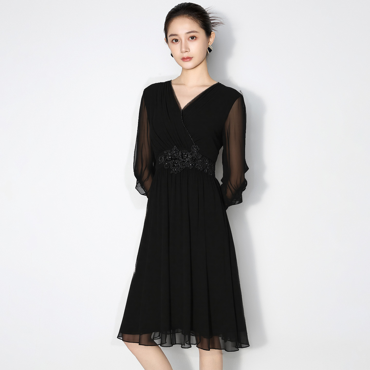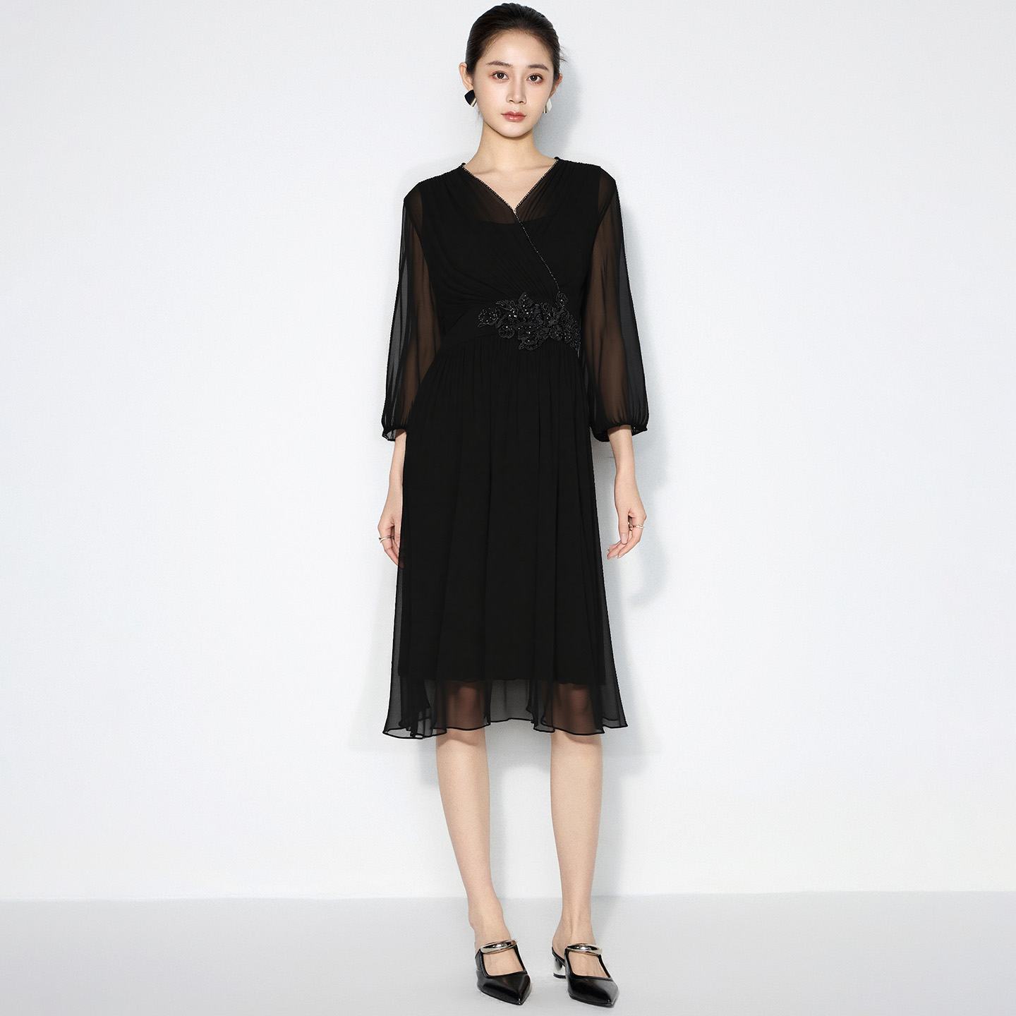 流行女 黑色钉珠V领连衣裙子绣花收腰气质时尚 马天奴2025秋季 新款