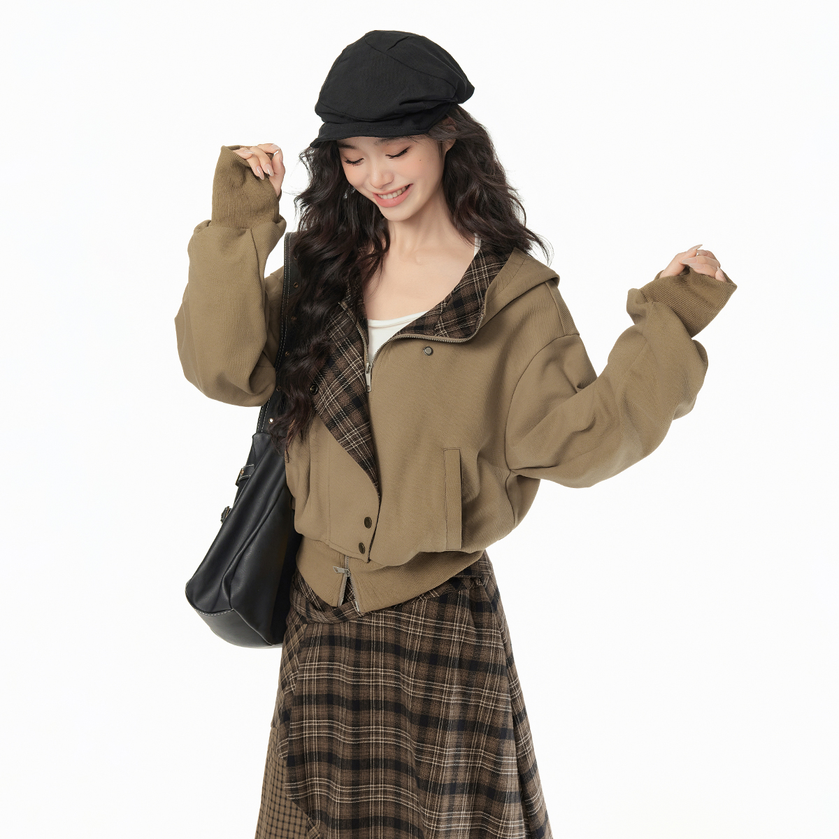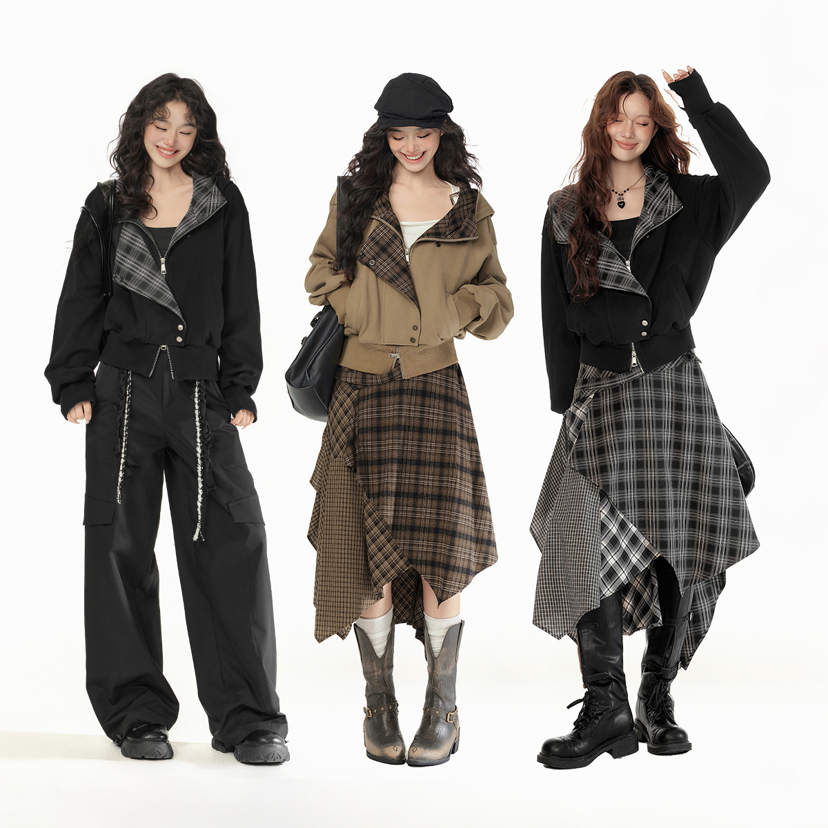 上衣男女 复古翻领夹克格子拼接短外套潮休闲工装 Achock官方店