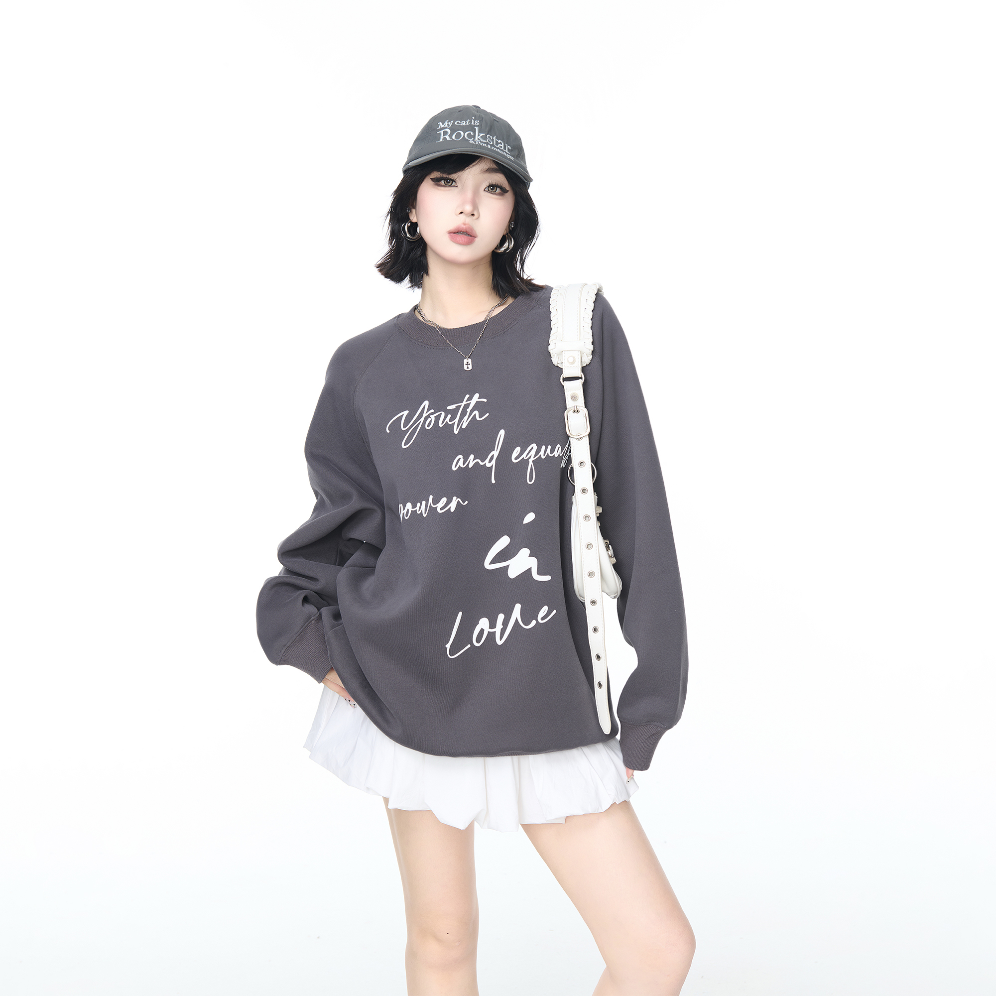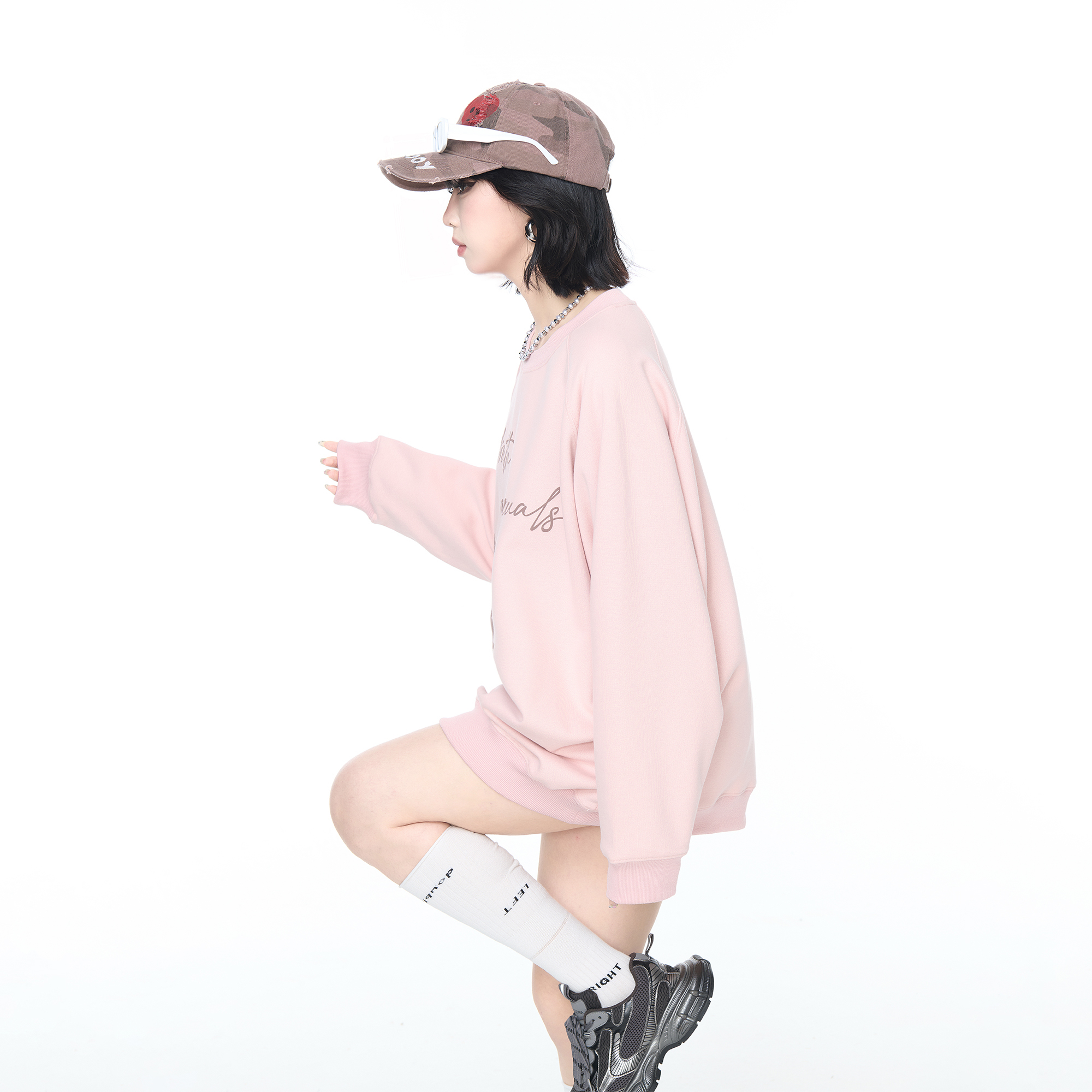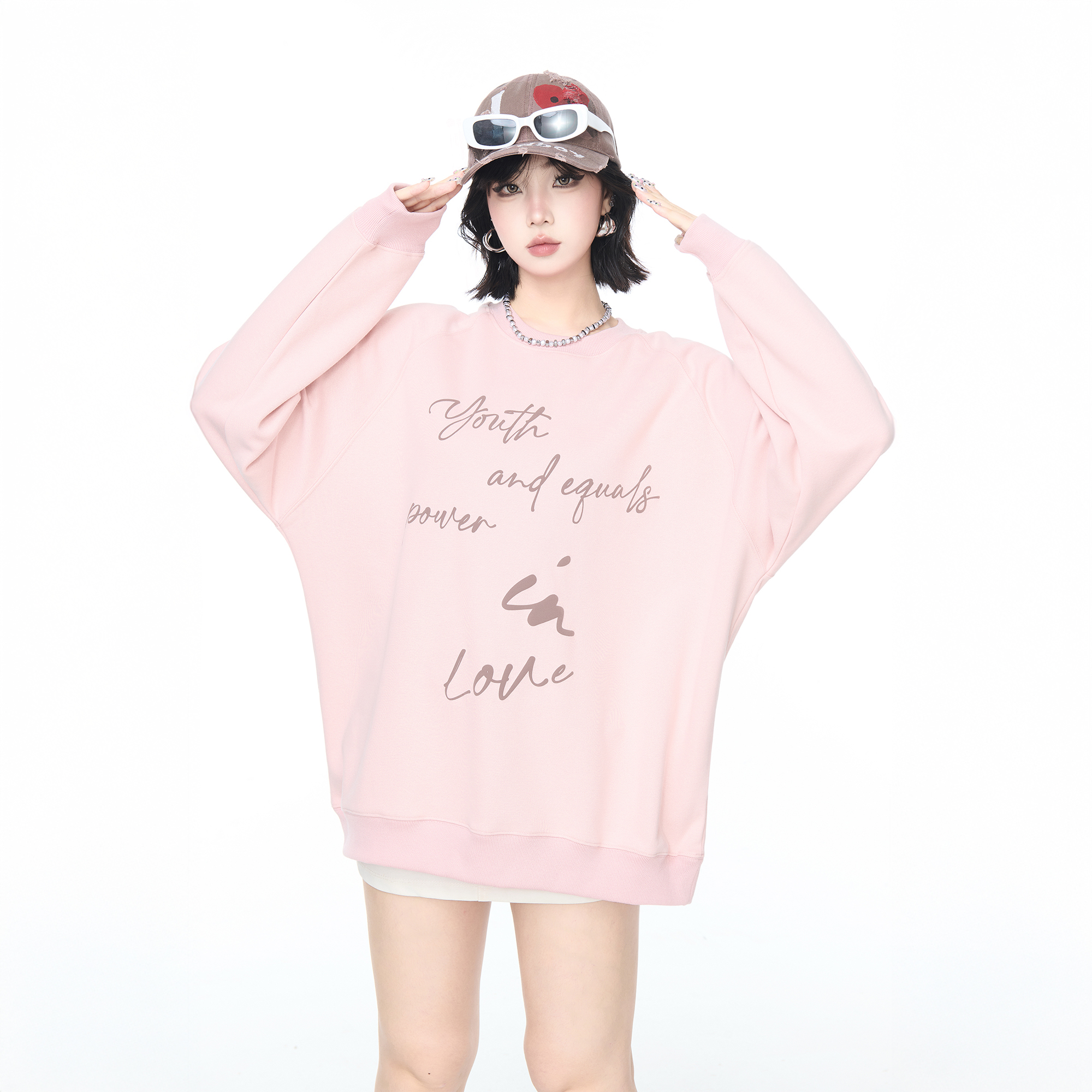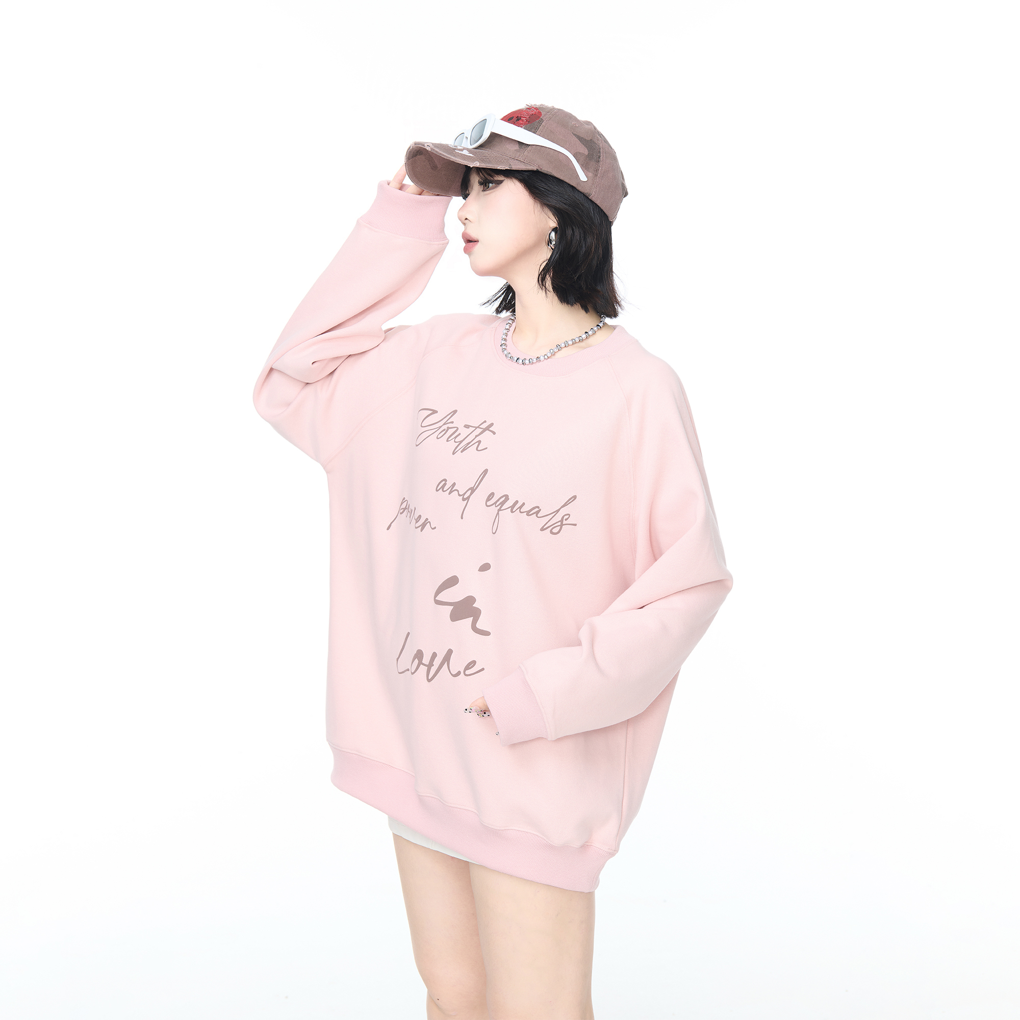 YEP粉色圆领发泡印花卫衣外套女春秋新款 复古宽松慵懒风上衣 美式