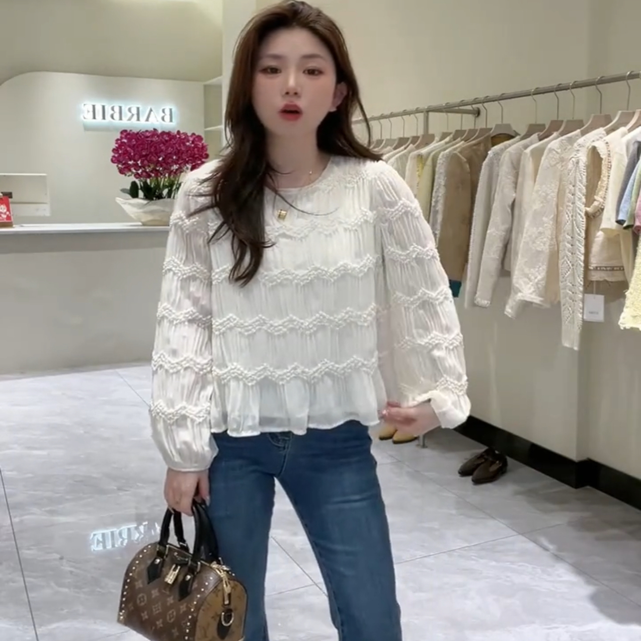 圆领上衣潮 女气质甜美褶皱肌理设计感2025春款 法式 高级感轻纱小衫