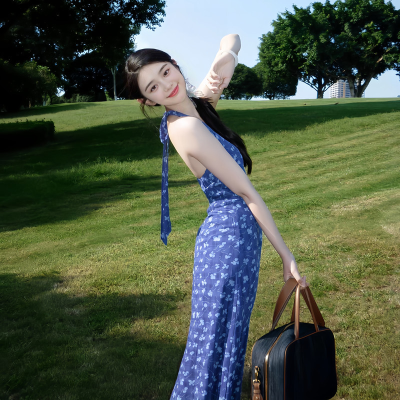 赵露思同款 性感露背度假叠穿连衣裙 紫色碎花挂脖长裙女2025夏新款