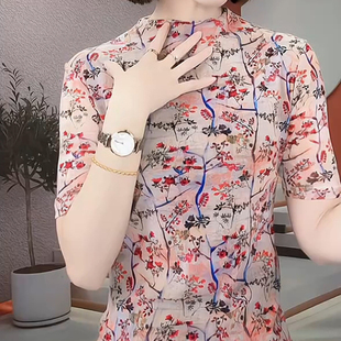 女款 妈妈装 气质网纱印花洋气时髦t恤女修身 大码 潮 夏季 冰丝短袖