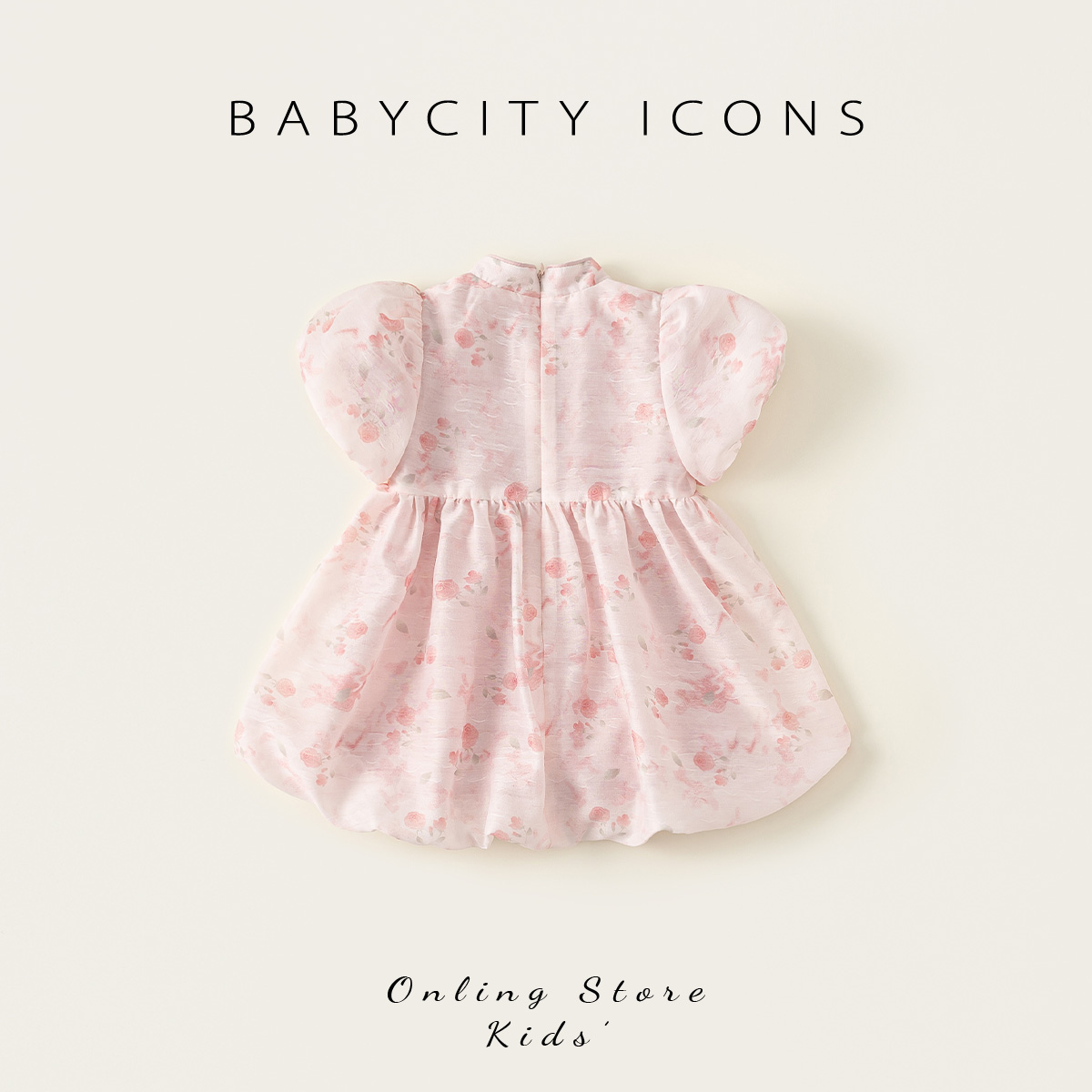 BCBG25早秋新款 流行设计感花卉印花花边褶皱立领系带女连衣裙 时尚