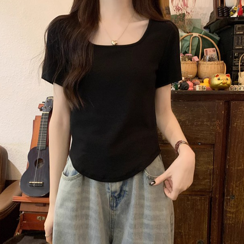 高级感洋气上衣 新款 大码 胖mm遮肚子百搭显瘦别致正肩U领t恤女夏季