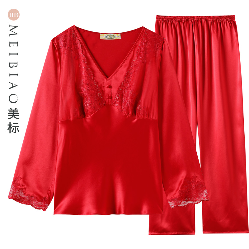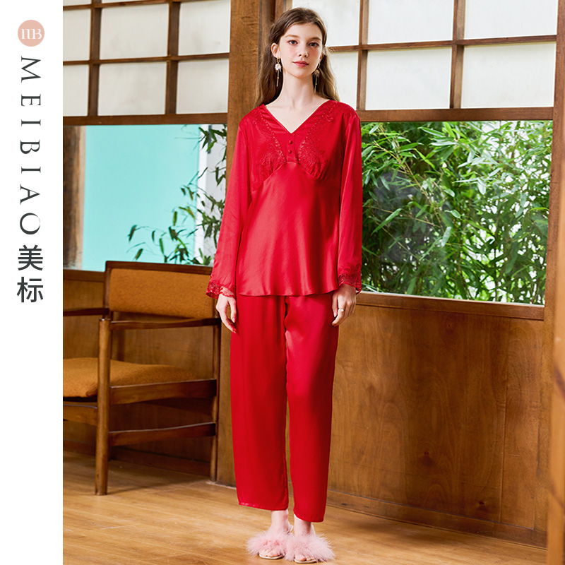 美标重磅真丝睡衣套装 女春秋本命年红色婚庆100%桑蚕丝蕾丝家居服