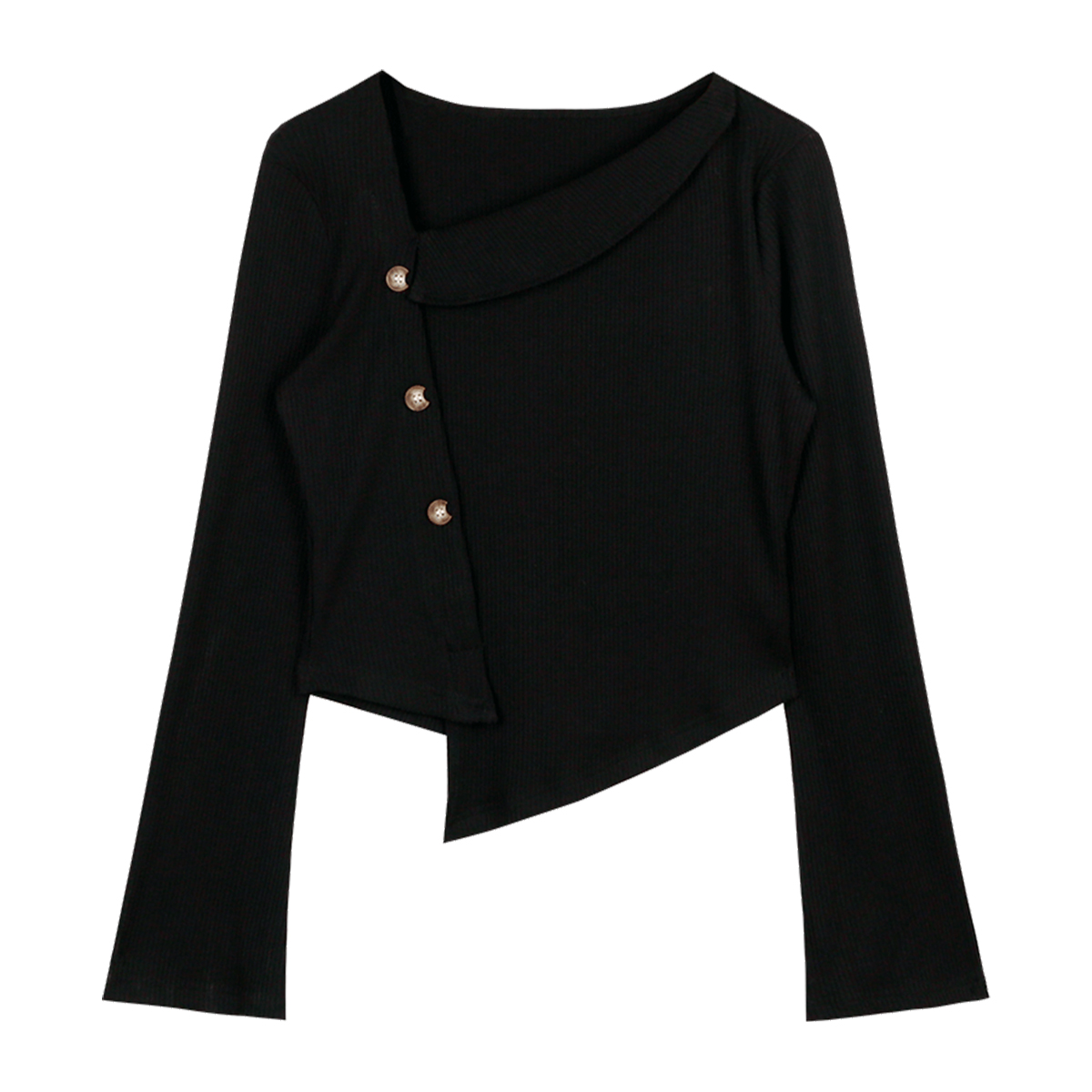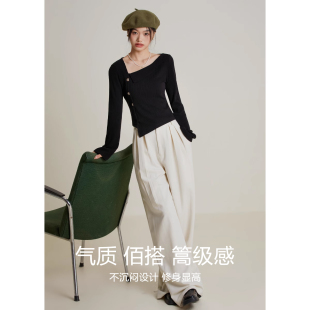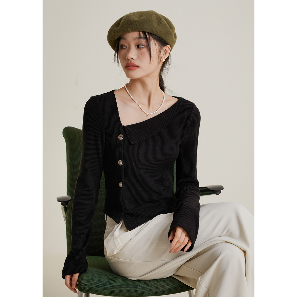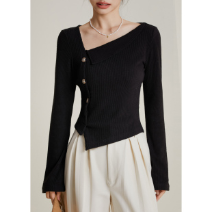 斜肩上衣女春秋毛衣内搭打底衫 法式 针织衫 弥古黑色不规则v领长袖