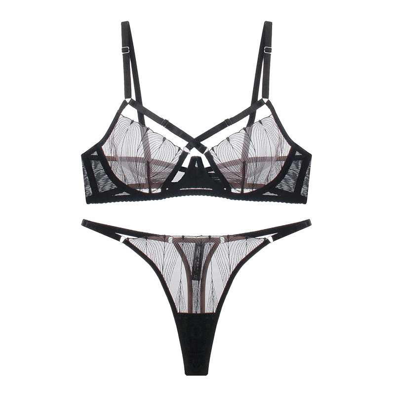 交叉网纱睫毛蕾丝钢圈文胸镂空内衣套装 法式 表白 爱