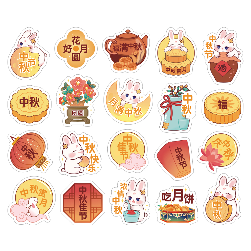 中秋节快乐萌兔异形祝福文字贴纸可爱卡通小学生幼儿园儿童衣服图标月饼礼盒装 饰贴画手工自制礼物盒子封口贴