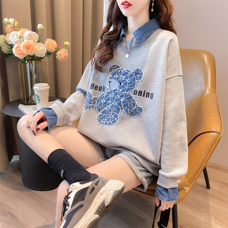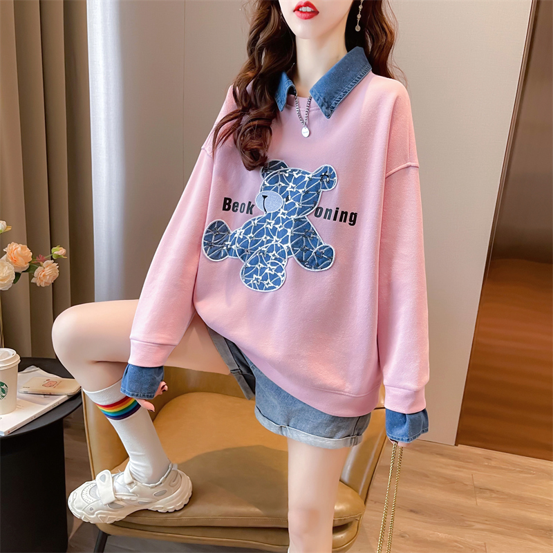 t恤假两件上衣外套 polo领长袖 早秋娃娃领卫衣女春秋韩版 宽松薄款
