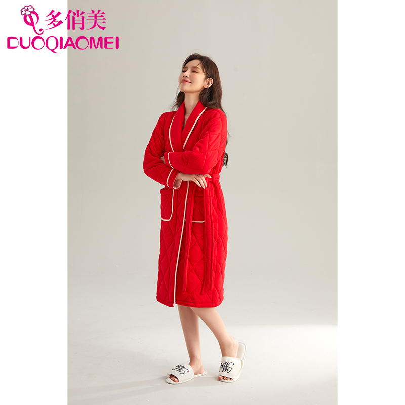睡衣红色本命年浴袍家居服冬款 睡袍女秋冬季 三层夹棉加厚纯棉长款