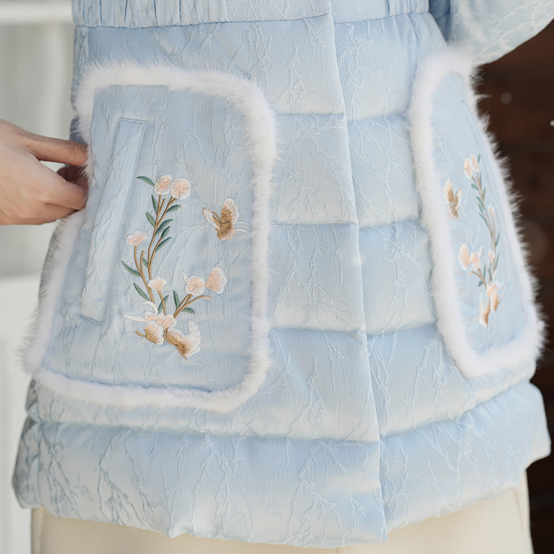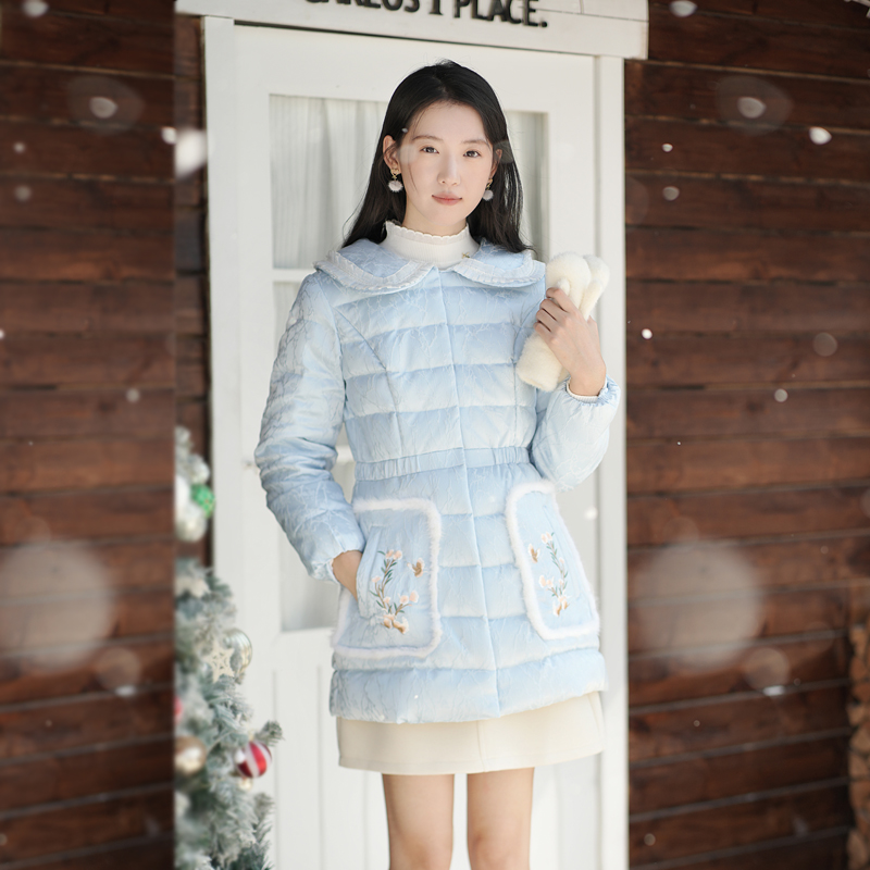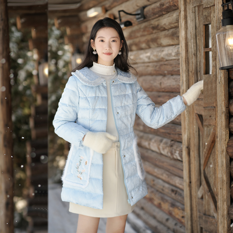 绣花收腰保暖翻领外套 水貂毛拼接中长羽绒服女 ATAR甜美冬季 新品