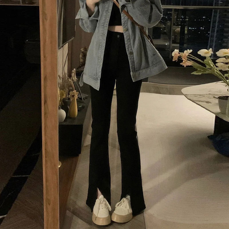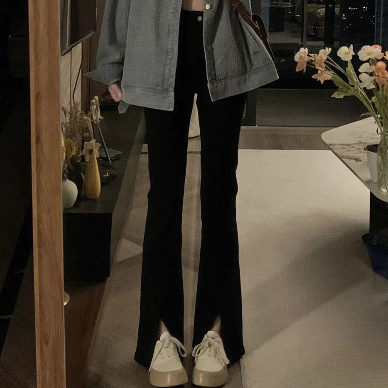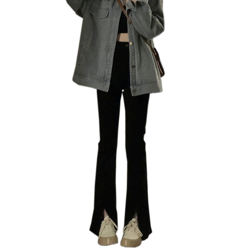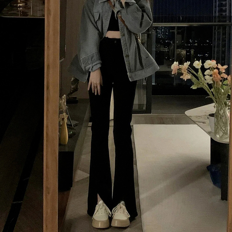 拖地高腰直筒马蹄长裤 修身 子 女早春新款 黑色弹力微喇叭开叉牛仔裤