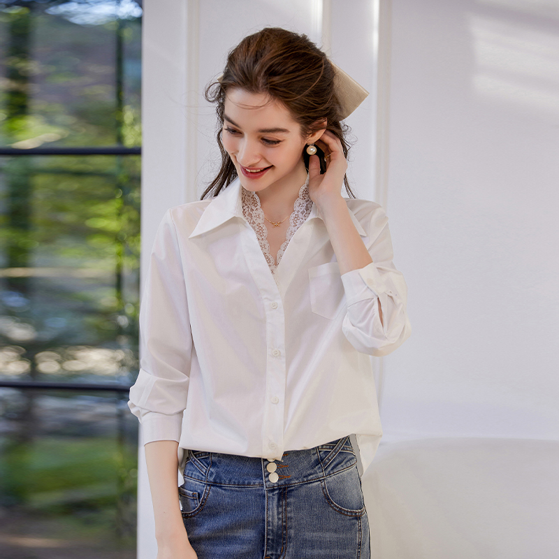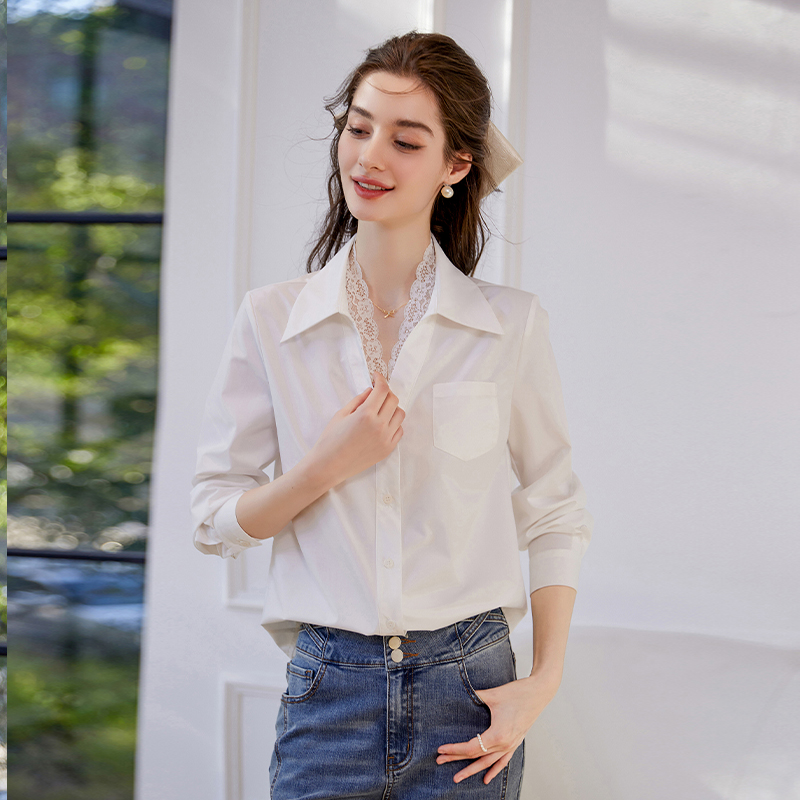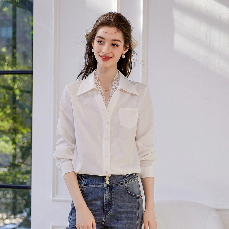 气质翻领单排扣百搭衬衣女 新款 白鹿语浪漫拼接蕾丝衬衫 2025春季