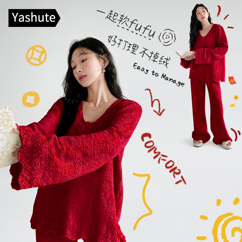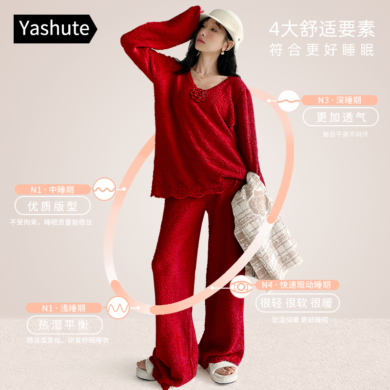 高级感红色半边绒山茶花睡衣新年款 加绒女士可外穿家居服 秋冬季