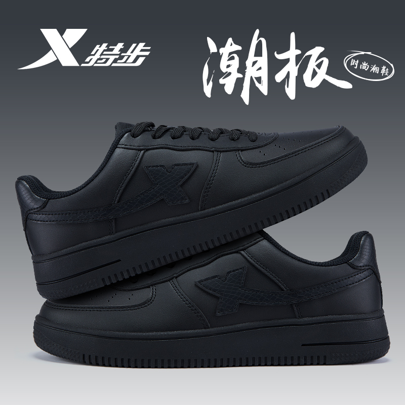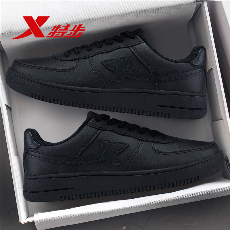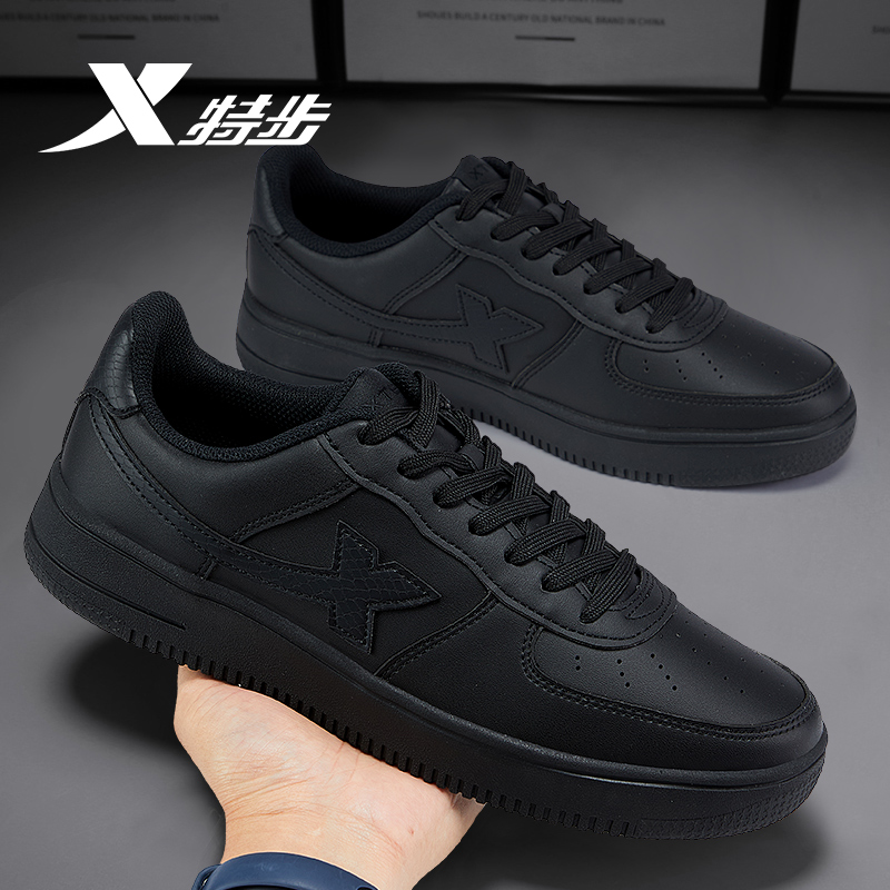 秋季 2025新款 运动鞋 轻便皮面休闲鞋 男 特步男鞋 百搭小黑鞋 黑色板鞋