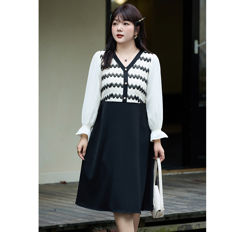 女装 气质V领收腰A字遮肉长袖 秋装 法式 显瘦胖MM连衣裙 新款 绮娑大码