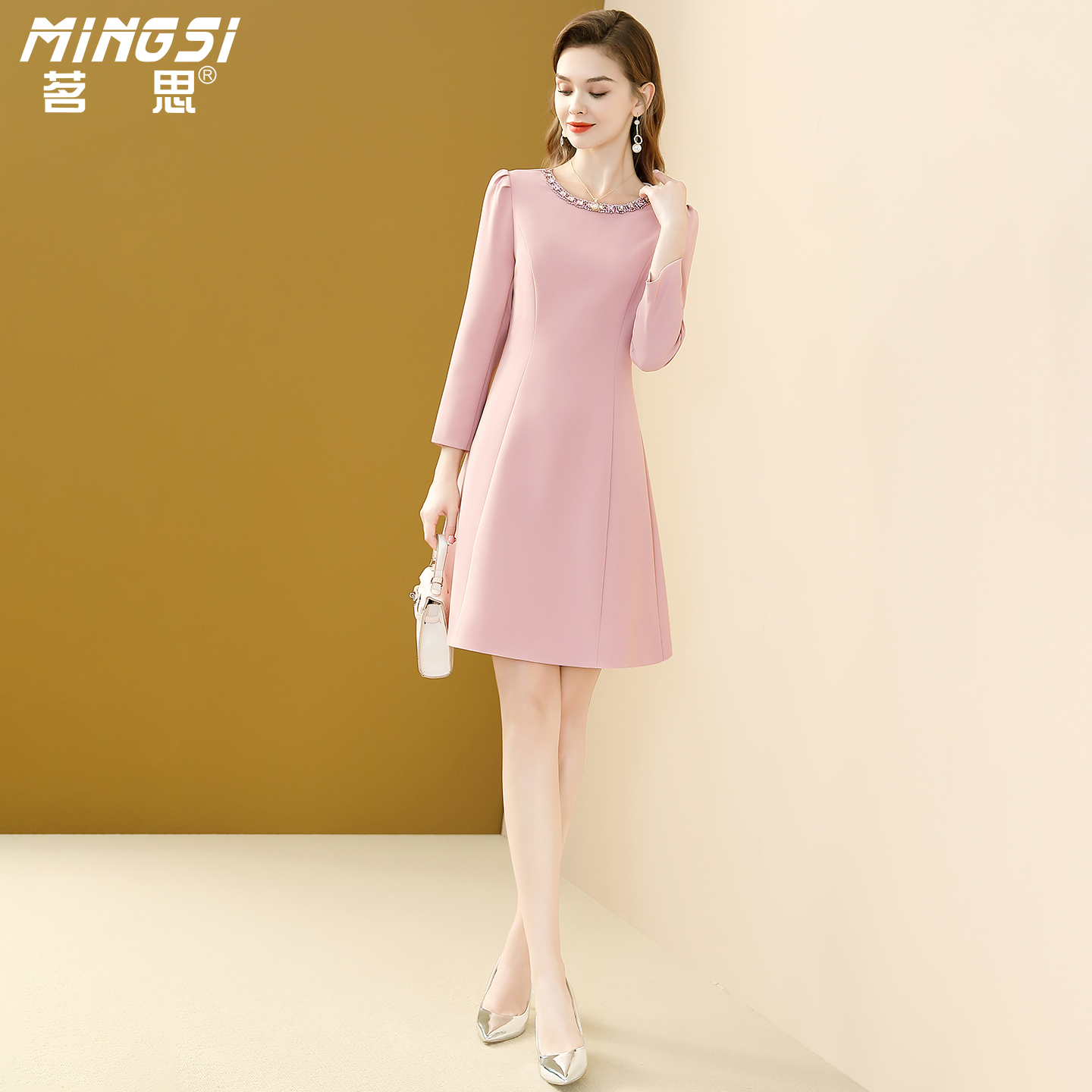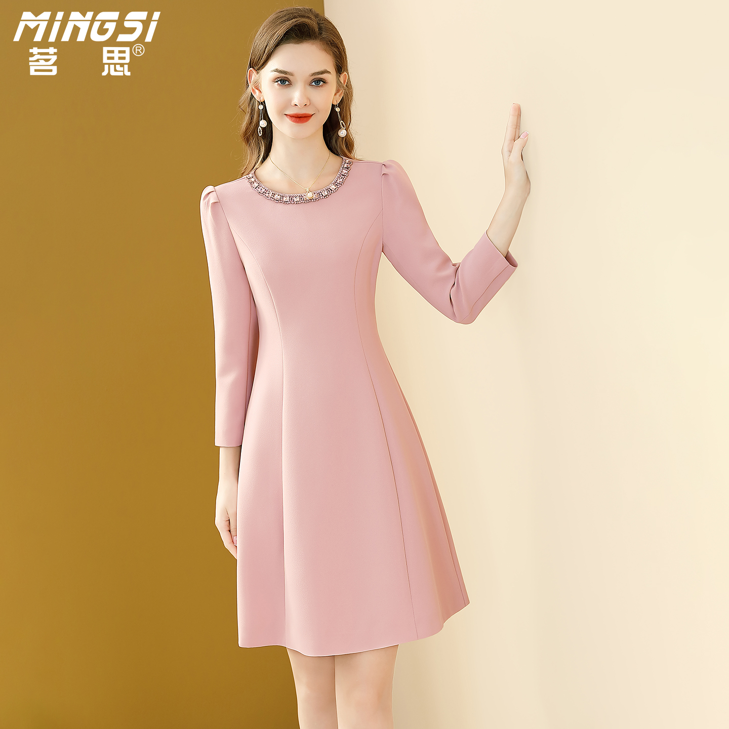 茗思粉色千金风连衣裙女2025秋装 名媛镶钻收腰显瘦小个子裙子 新款
