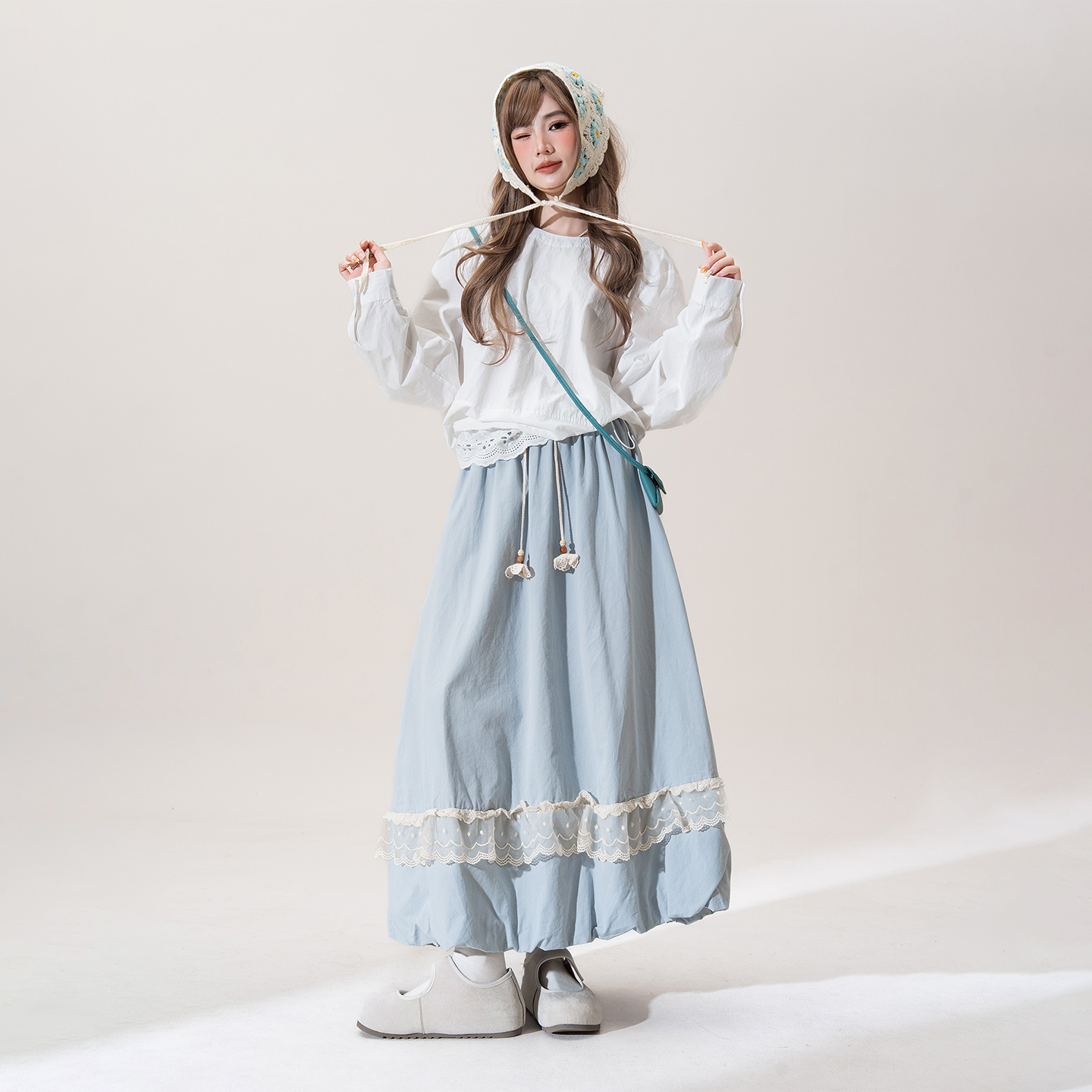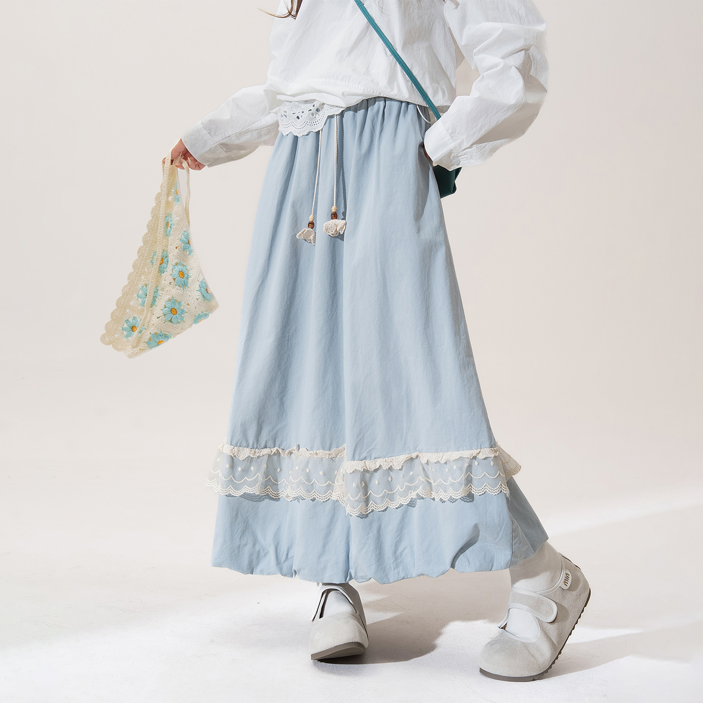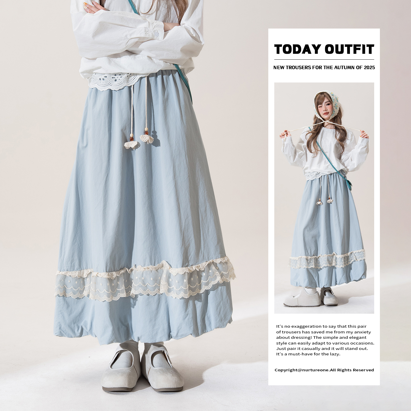江南先生NewJNXS复古格纹蓝色蕾丝拼接半身裙春秋女长款 格子半裙