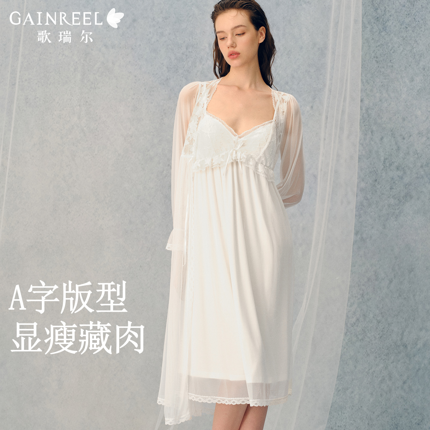 歌瑞尔冰丝感薄纱吊带睡裙女法式 蕾丝带胸垫睡衣度假风家居服套装