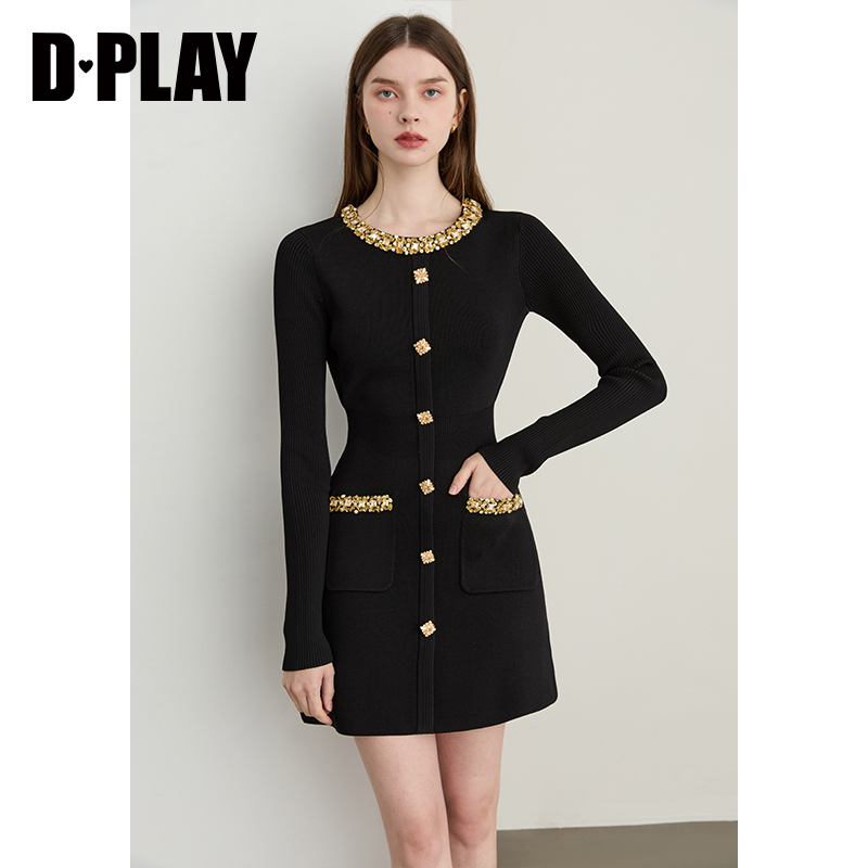 新款 2025秋季 黑色轻奢气质连衣裙女针织裙子小黑裙 黑标 DPLAY