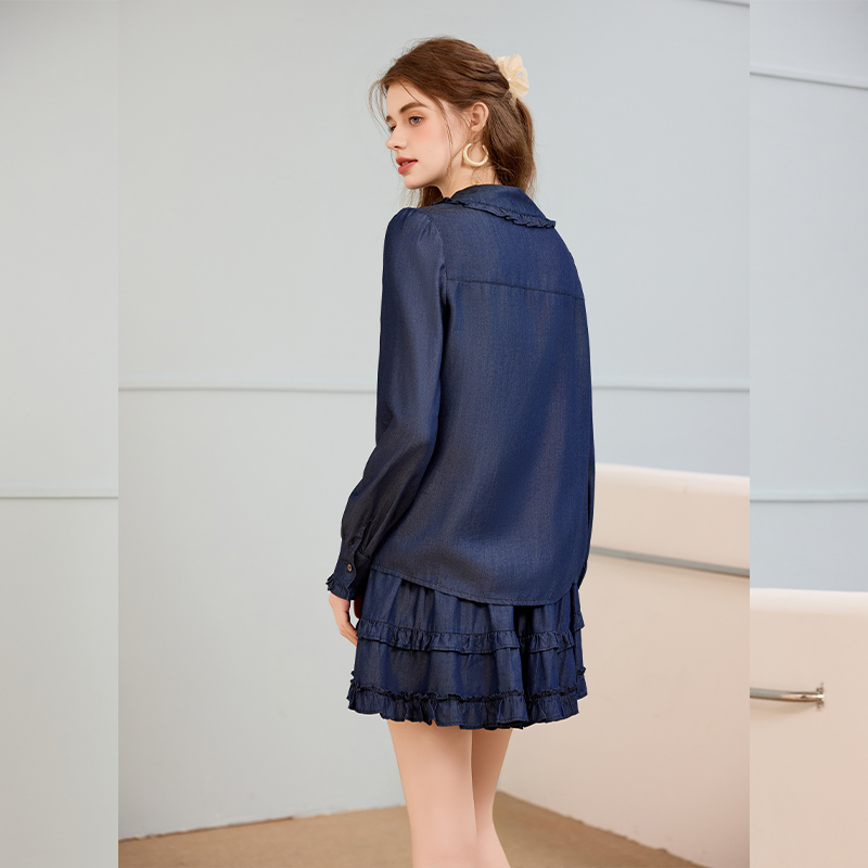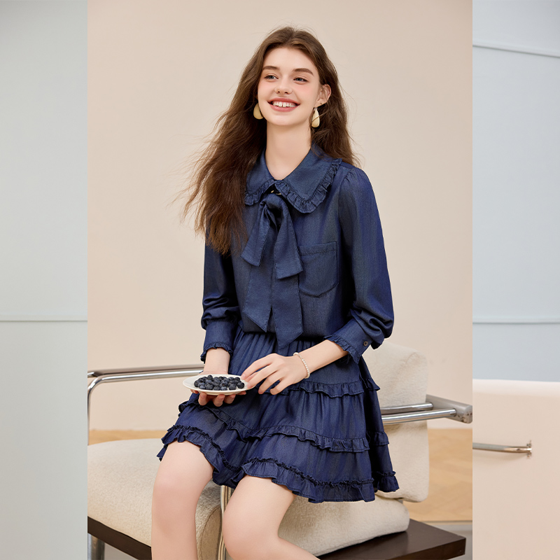 半裙两件套 荷叶边蝴蝶结衬衫 白鹿语复古甜美天丝牛仔套装 25秋新款