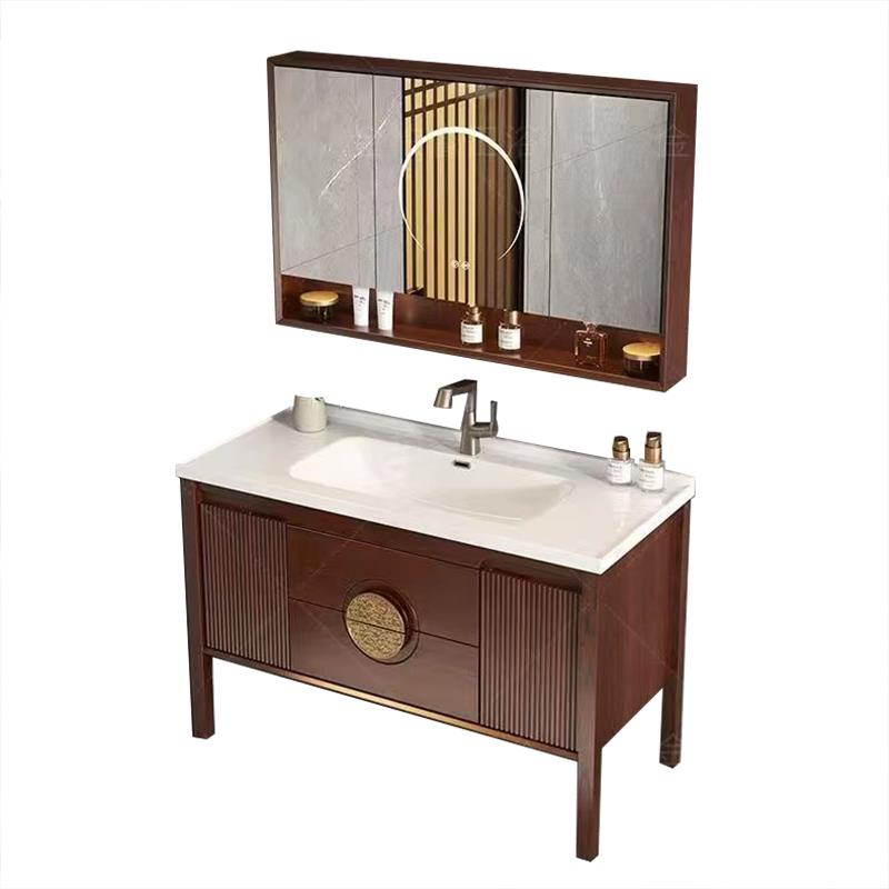 乌金木双盆洗手盆柜组合 落地式 中式 橡木浴室柜陶瓷一体盆2025新款