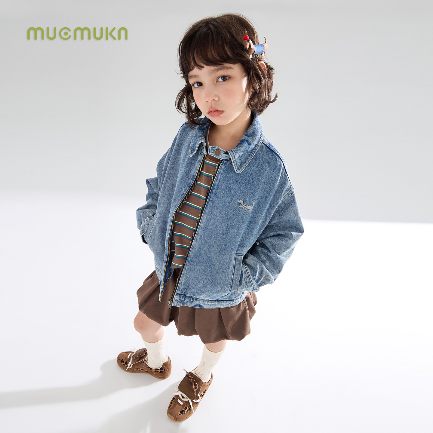 复古百搭女童秋新 全棉软牛仔腊肠狗绣花夹克外套短款 丹宁假日