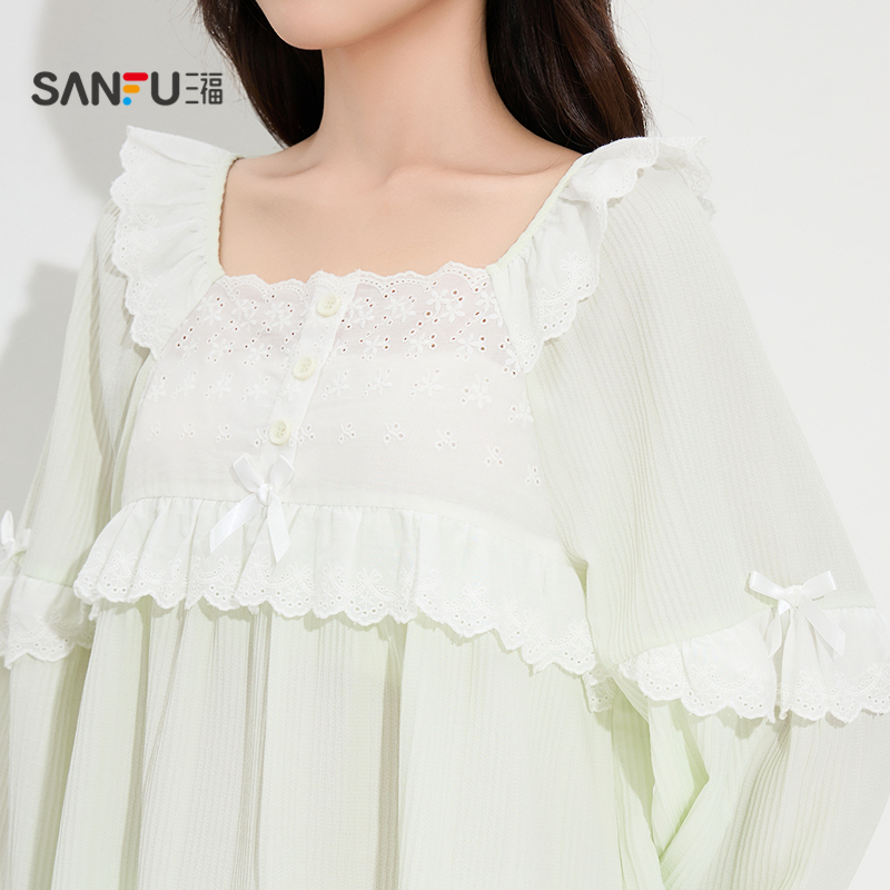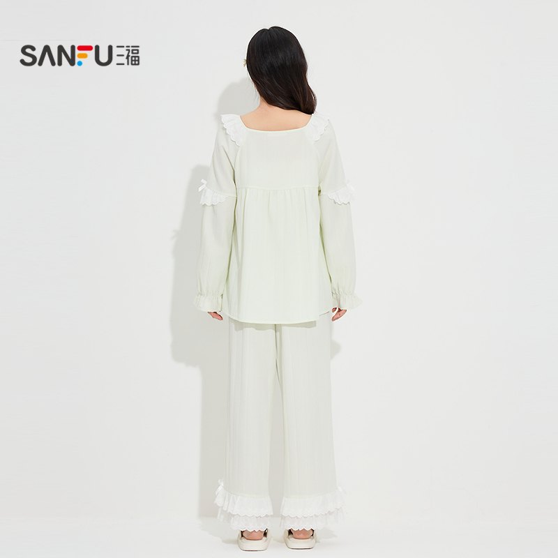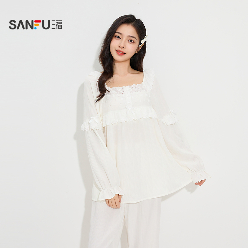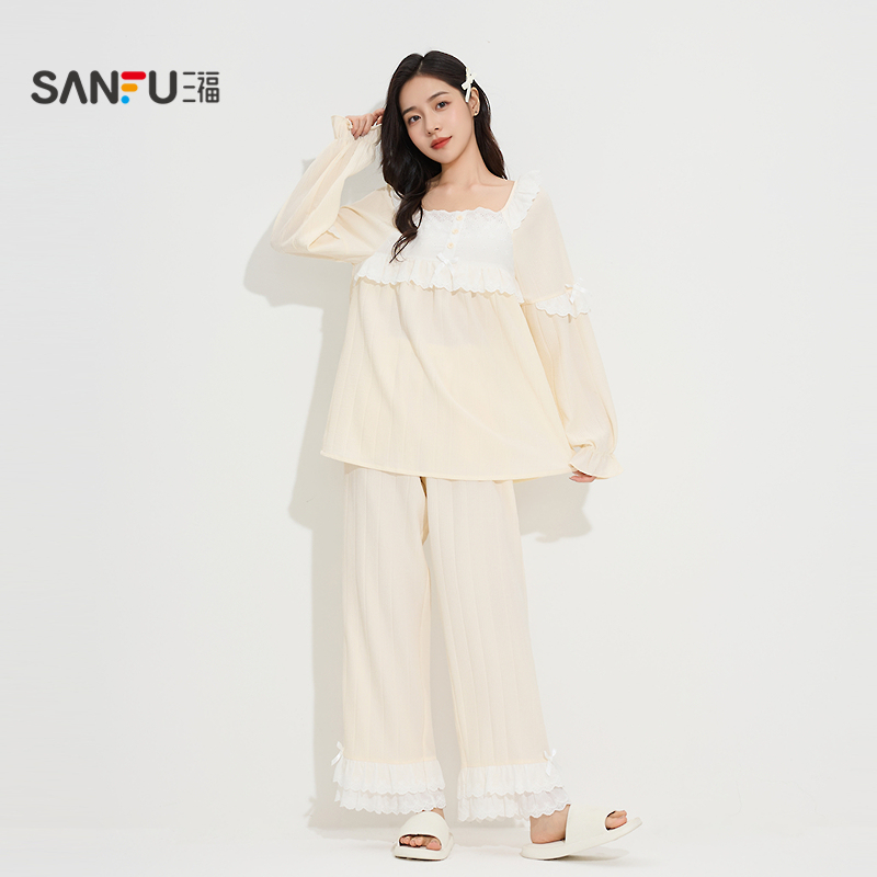 睡衣套装 田园宫廷风长袖 拼接荷叶边家居服女504620 新款 三福女秋季