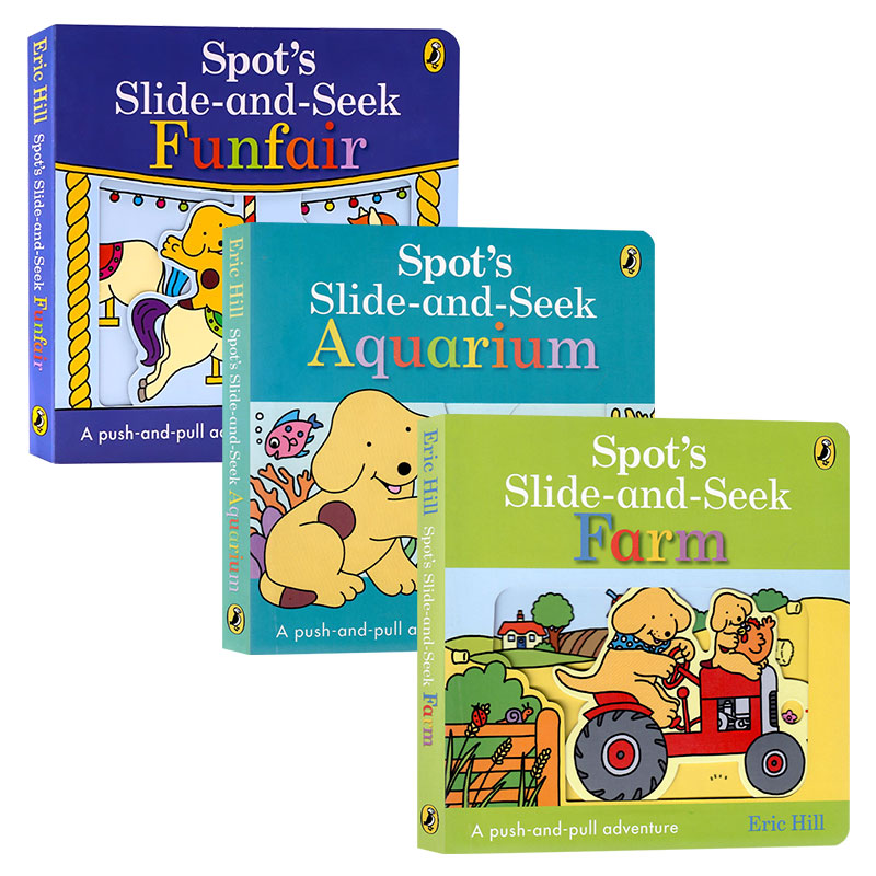 and 推拉转滑动趣味玩具书亲子互动 绘本 低幼启蒙机关操作纸板书撕不烂 Farm Seek Slide Spot 英文原版 小玻机关操作书系列3册