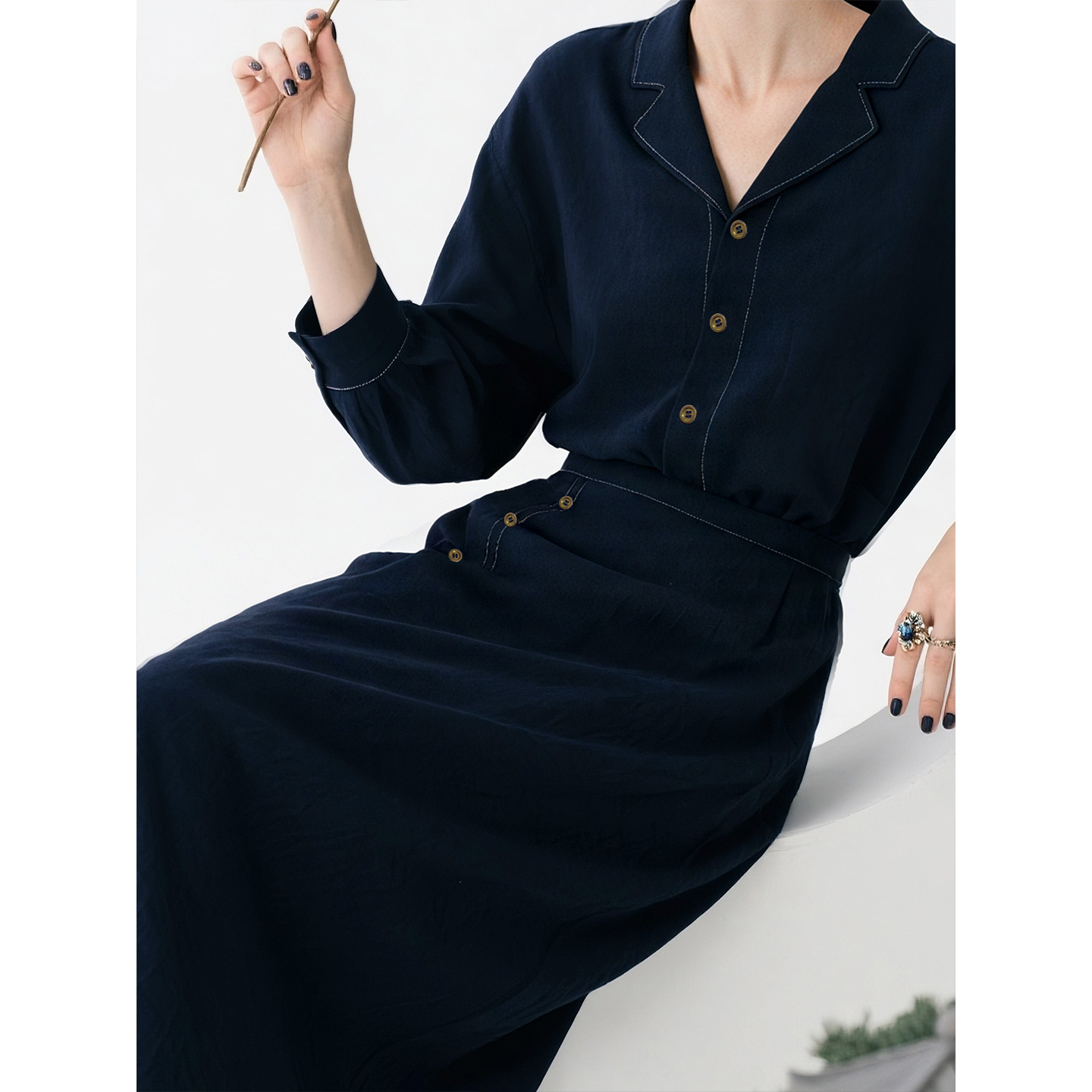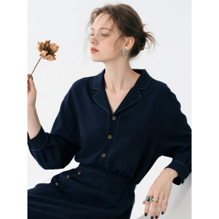 职业衬衫 新款 半身裙两件套早秋穿搭 裙女2025年秋季 藏青色天丝套装