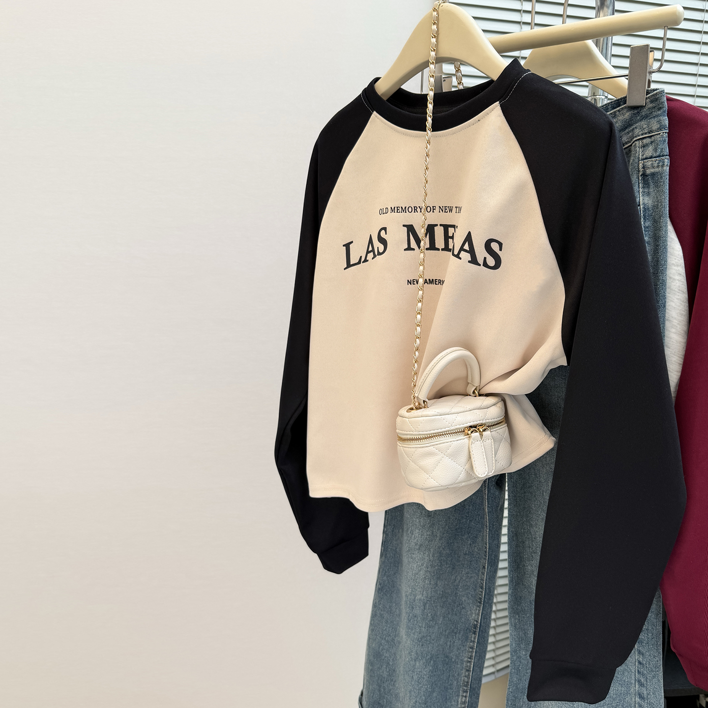 撞色长袖 插肩袖 圆领卫衣女春秋装 宽松韩版 上衣外套 薄款 小个子短款