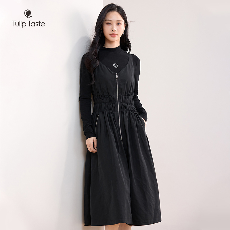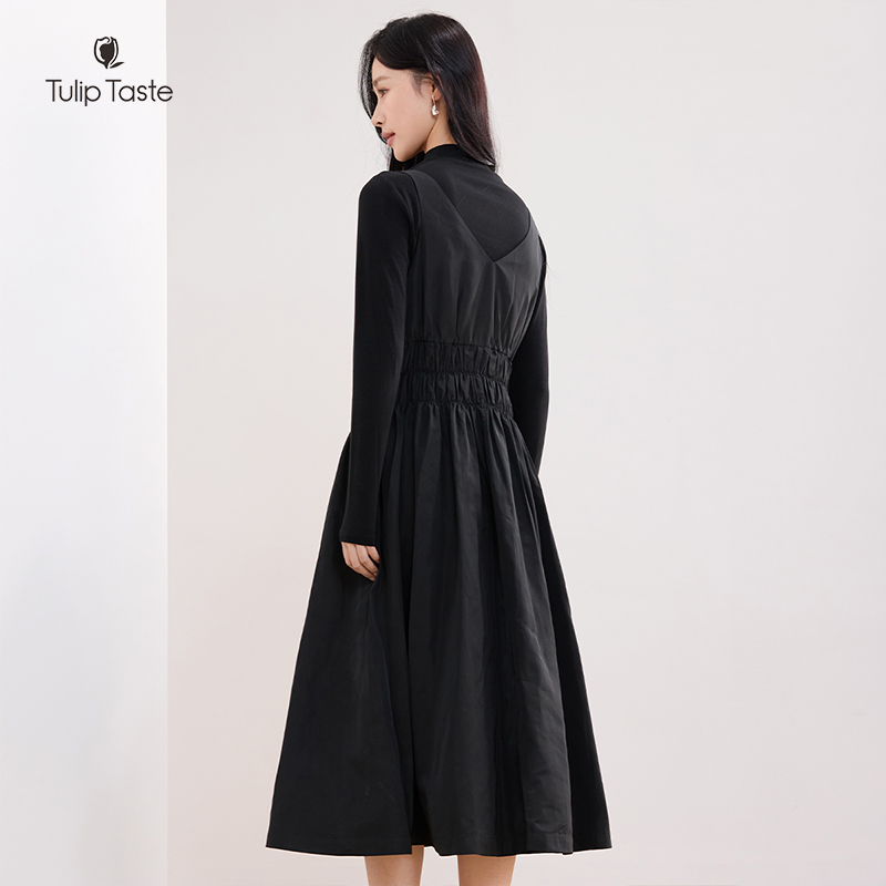 中长裙 气质设计感长袖 宝诗黎假两件拼接亮丝连衣裙女2025秋季 新款