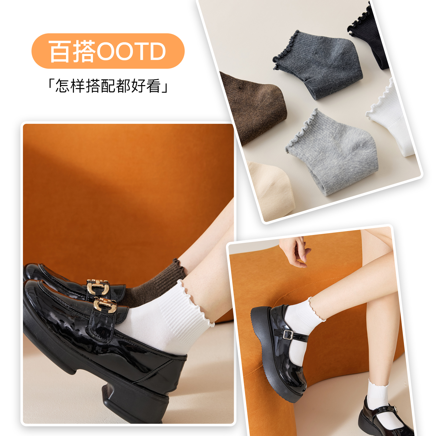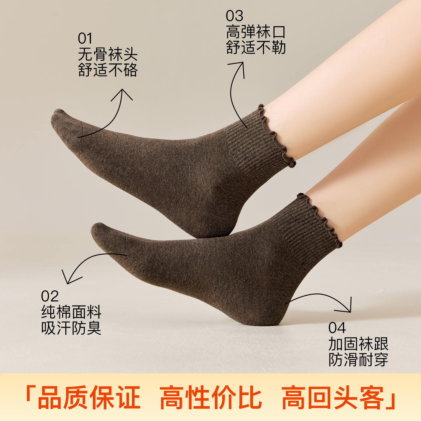 咖色袜子女秋纯棉中筒袜木耳花边无骨短袜抗起球防臭抗菌女士棉袜