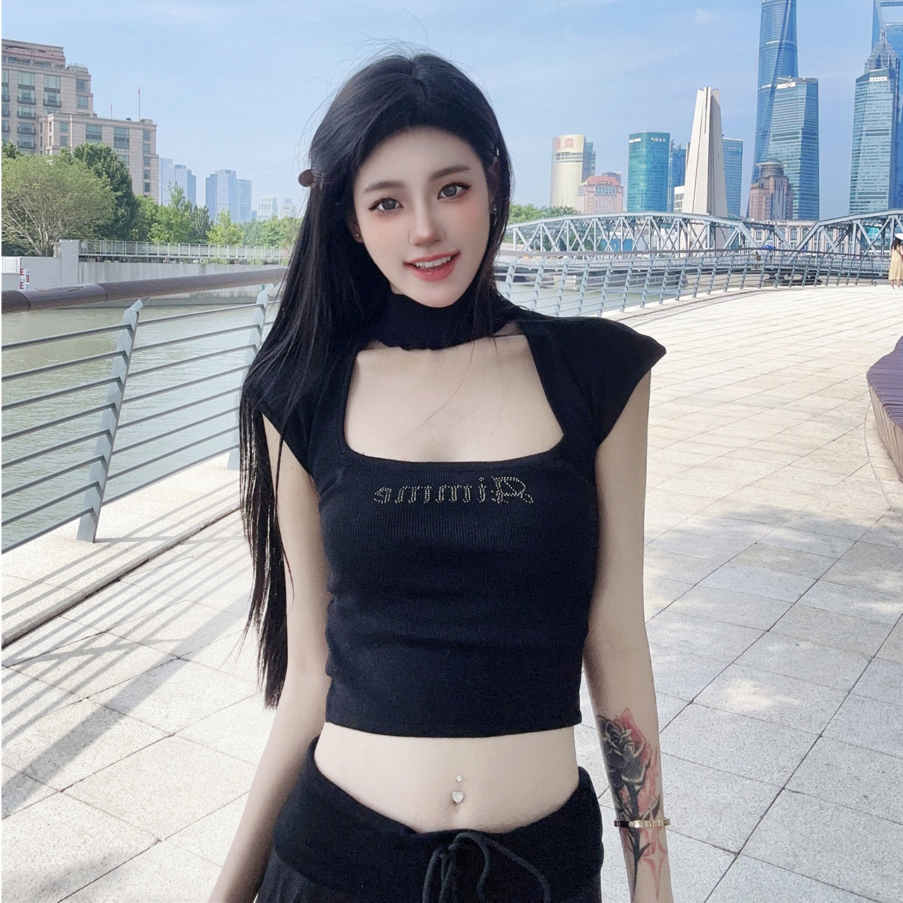 百搭A字裙子 珂莱蒂尔2025年黑色垂感半身裙女高腰时尚 玫瑰裙