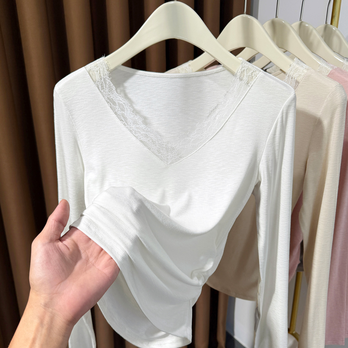 灰色V领蕾丝花边竹节棉长袖 褶皱收腰上衣 T恤女高级纯欲低领打底衫
