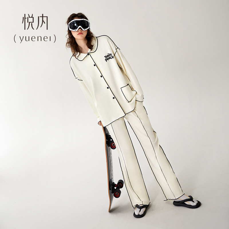 休闲运动风白色套装 悦内睡衣女春秋款 家居服潮流时尚 纯棉长袖 秋季