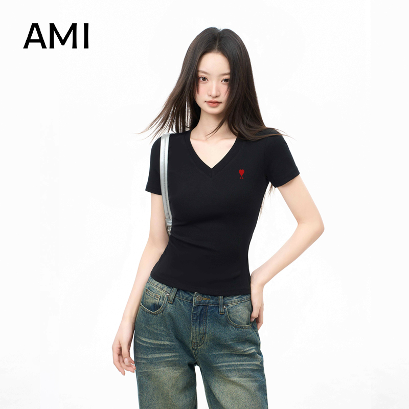 显瘦打底衫 AMI2025美式 修身 t恤女春秋潮牌正品 上衣 白色V领长袖