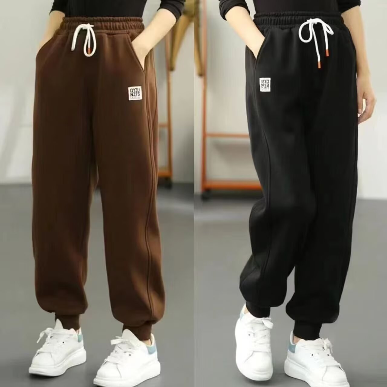 加绒街舞穿搭褶皱宽松休闲长裤 女秋冬季 子 灰色运动卫裤 自然涩美式