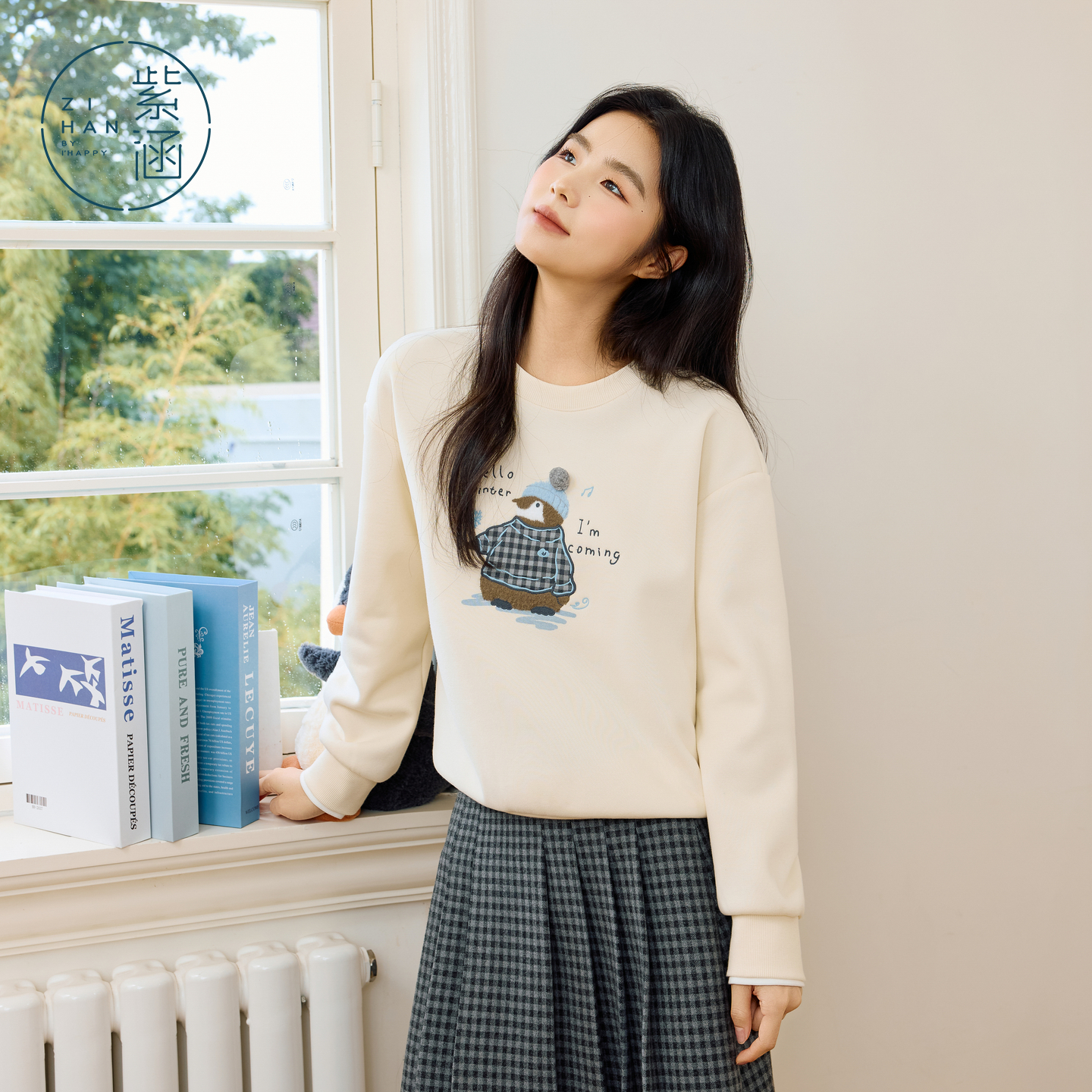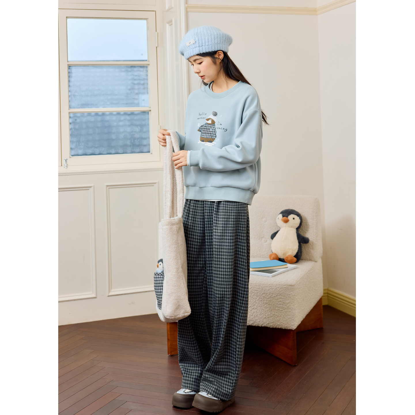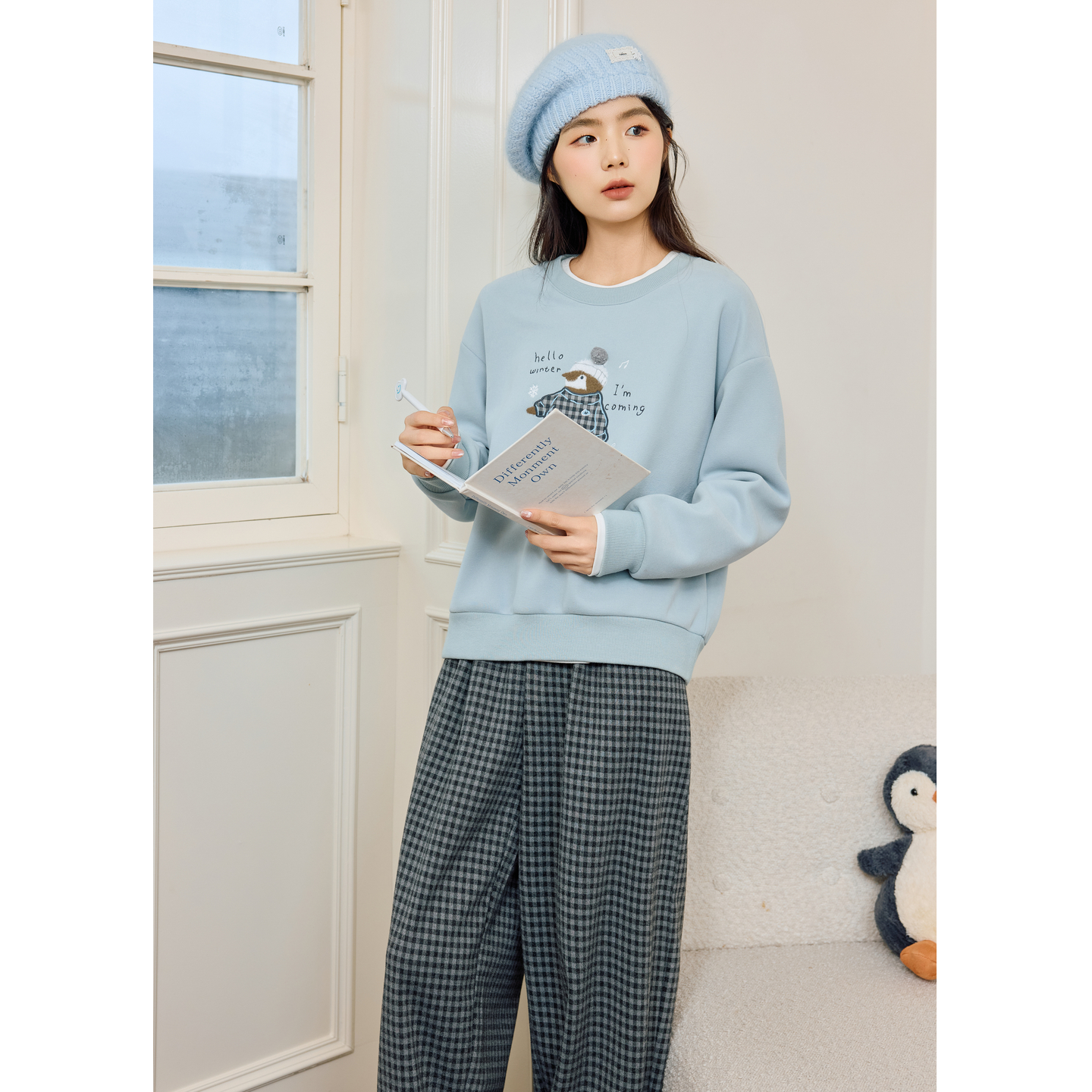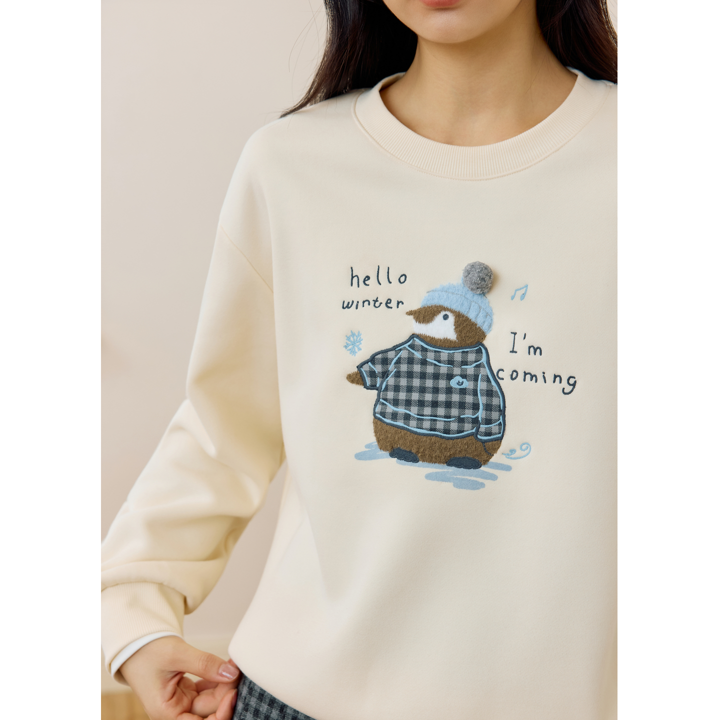 紫涵圆领加绒卫衣女2025年冬季 卡通企鹅刺绣宽松保暖套头上衣 新款