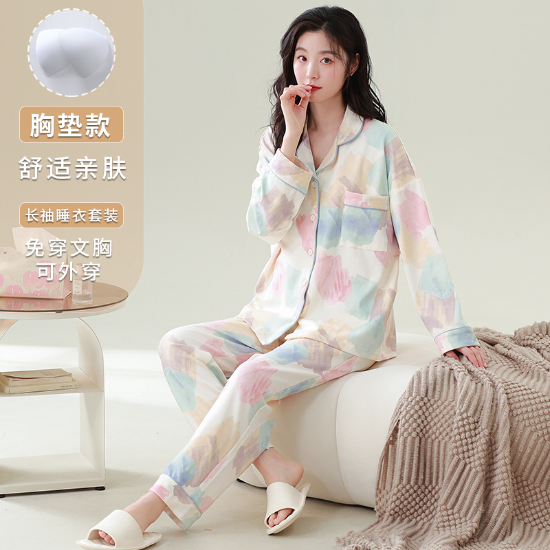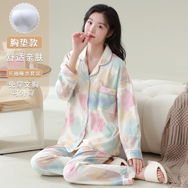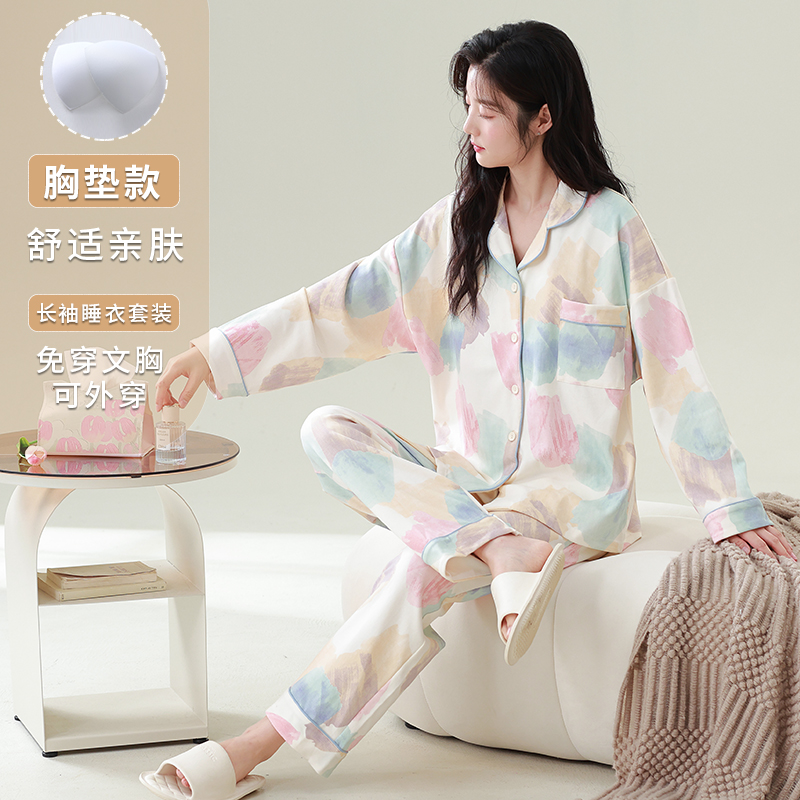 家居服女学生套装 睡衣秋冬女款 可外穿 长袖 高级感带胸垫防凸点开衫