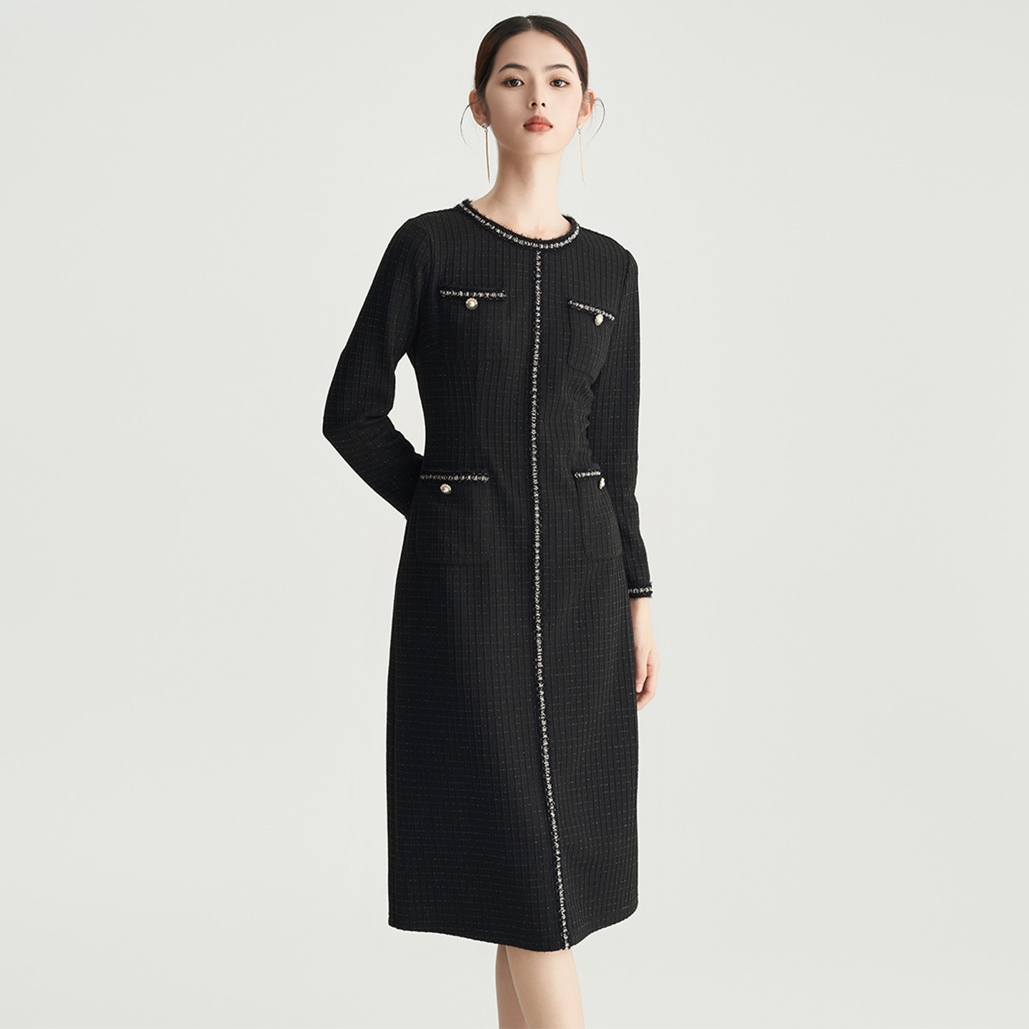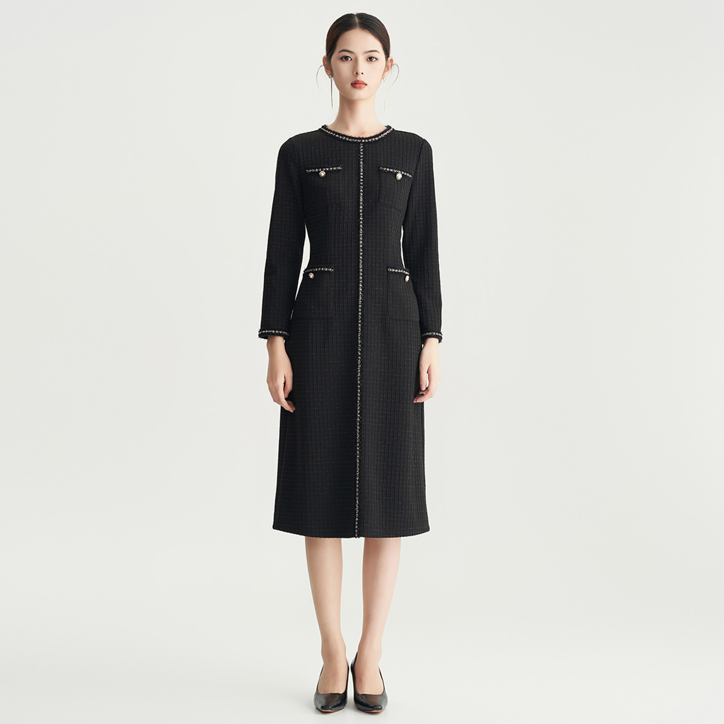 新款 裙女2025年秋季 钉珠木耳边显瘦连衣裙子 衬衫 预售黑色纯棉长袖