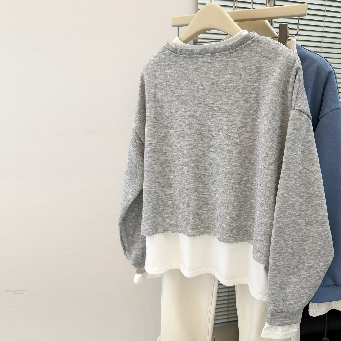 宽松韩版 薄款 无帽圆领上衣外套 卫衣女春秋装 设计感小众假两件长袖