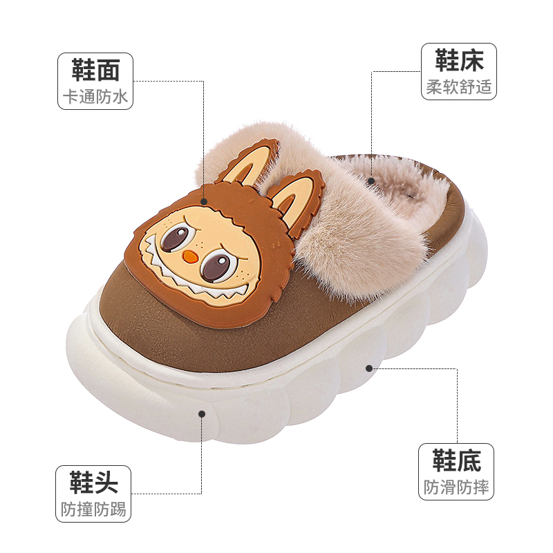 室内防滑PU皮面防水耐脏宝宝毛拖鞋 拉布布儿童棉拖鞋 男女童秋冬季
