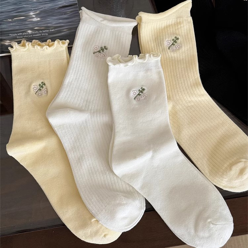 白色百搭透气冬季 纯棉中筒袜秋季 长袜 爆款 花边堆堆袜子女2025新款