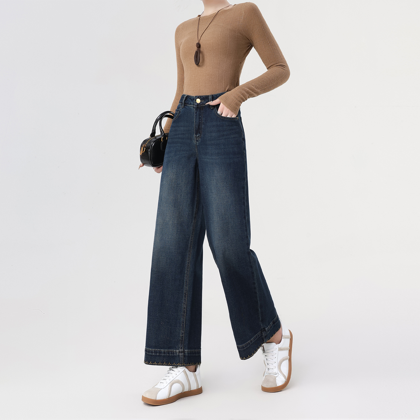 丹宁蓝弹力直筒拖地裤 女2025秋冬新款 加绒阔腿牛仔裤 今年流行爆款