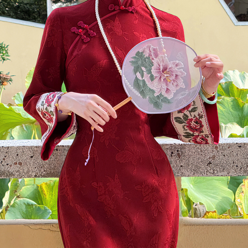 红墙蝴蝶倒大袖 新中式 红色刺绣旗袍秋冬日常可穿订婚小礼服国风