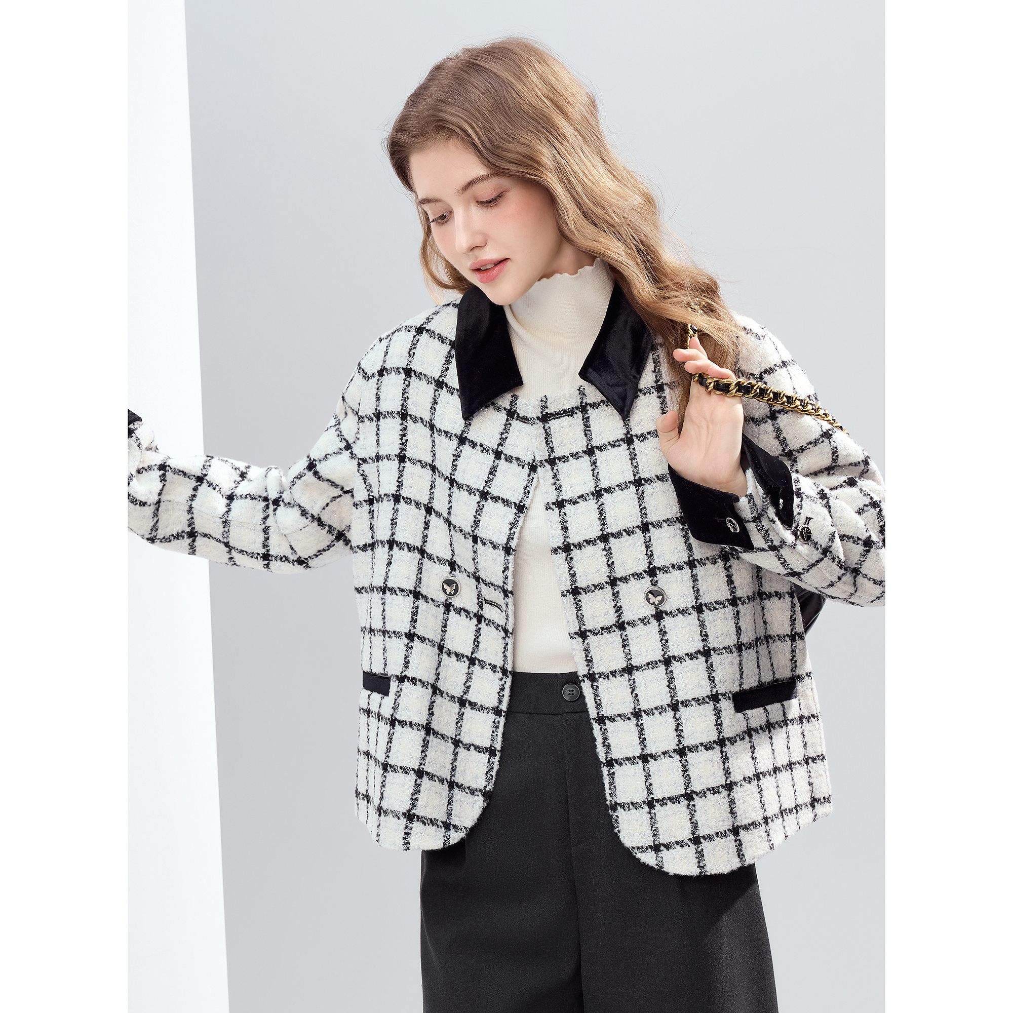 西装 短款 夹克 新款 betu百图小香风黑白格子毛呢外套女2025年冬季