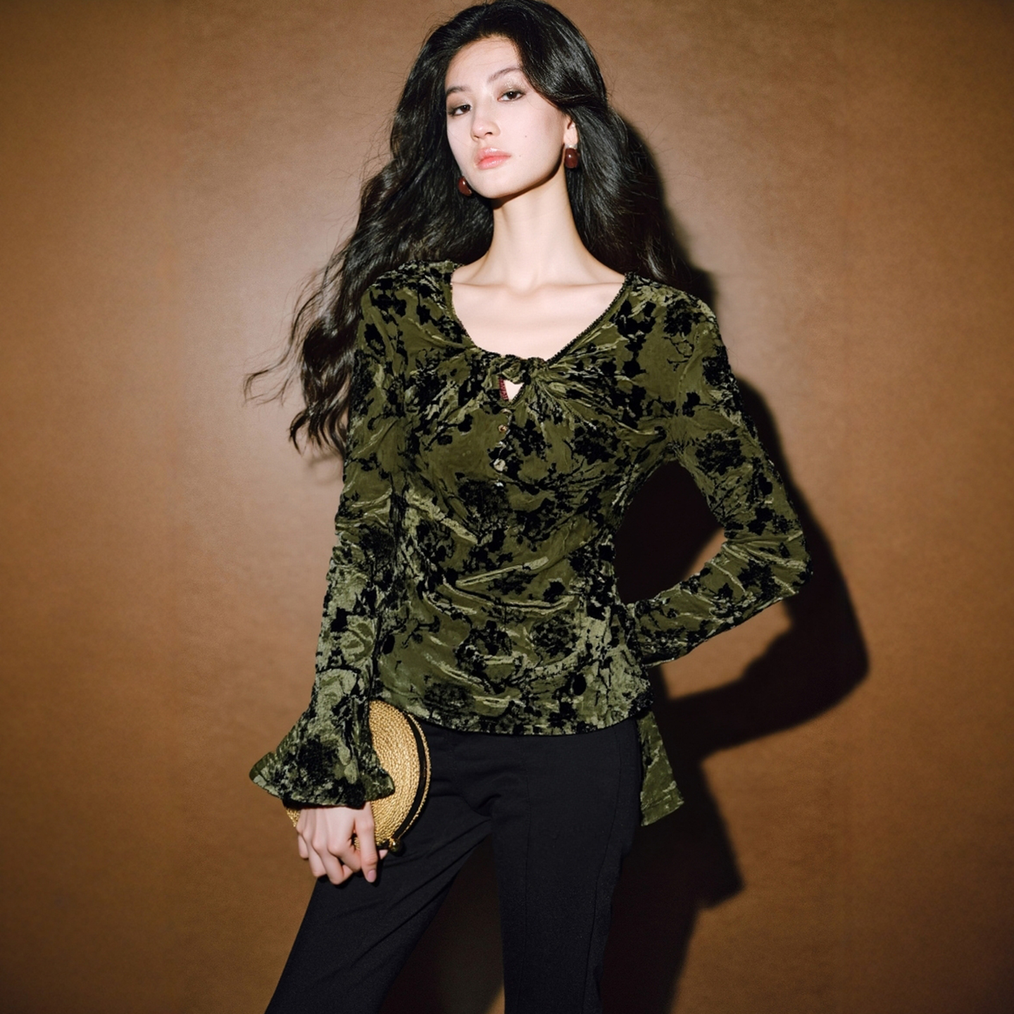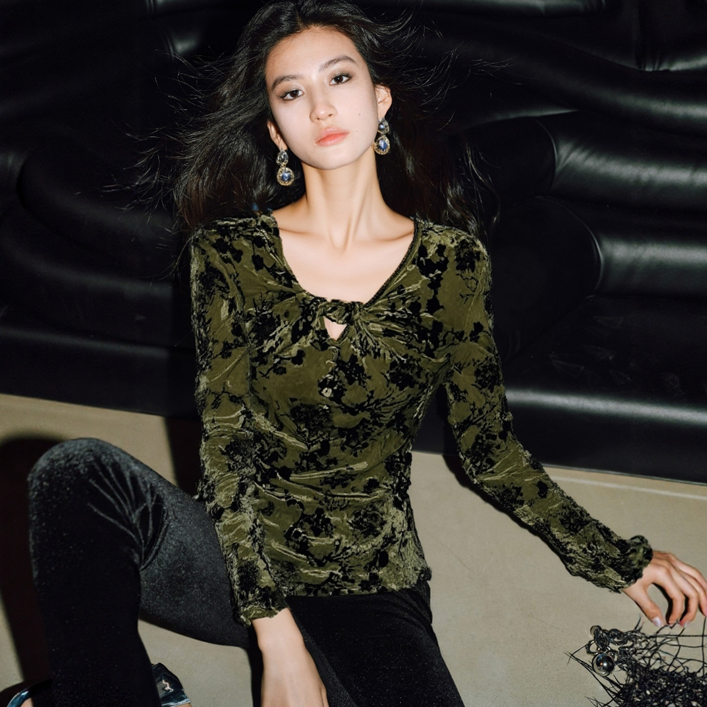 显瘦新中式 2025秋装 军绿金丝绒植绒上衣女修身 复古风长袖 T恤 新款