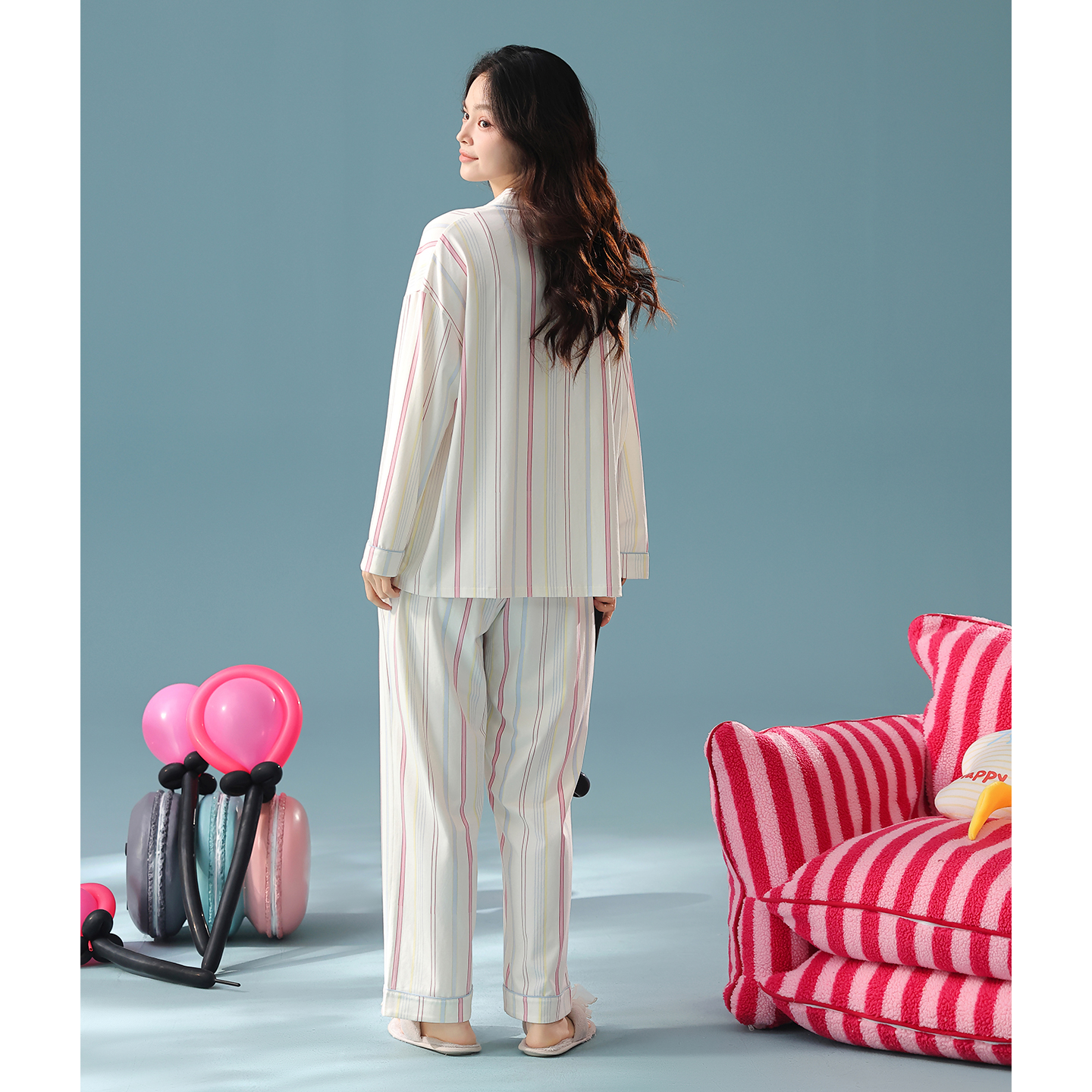 卡通休闲条纹抗菌防螨可外穿家居服 套装 芬腾睡衣女春秋季 棉质长袖