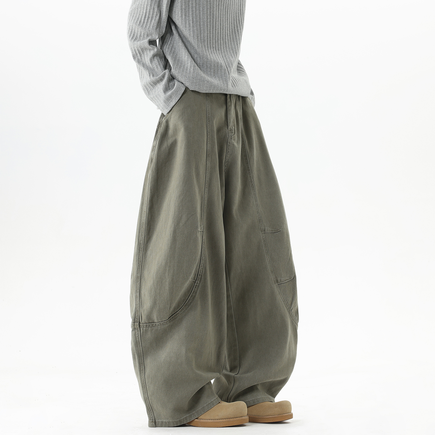 潮牌宽松阔腿百搭长裤 子男秋季 褶皱解构拼接卡其色弯刀休闲裤 美式